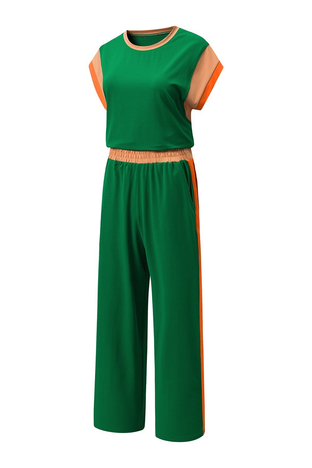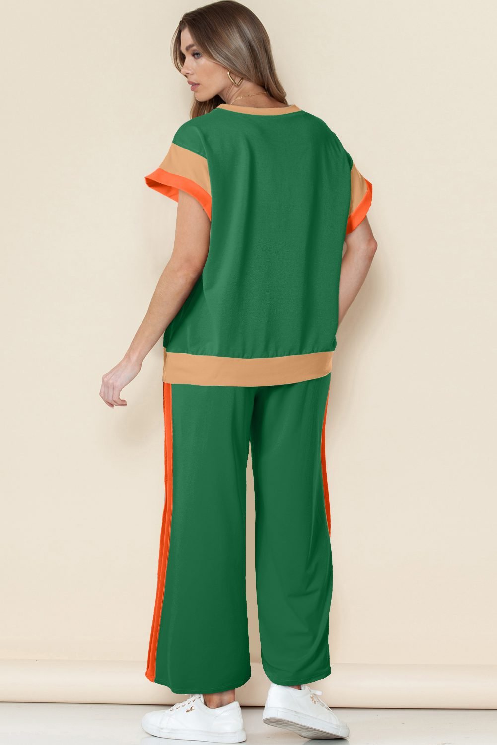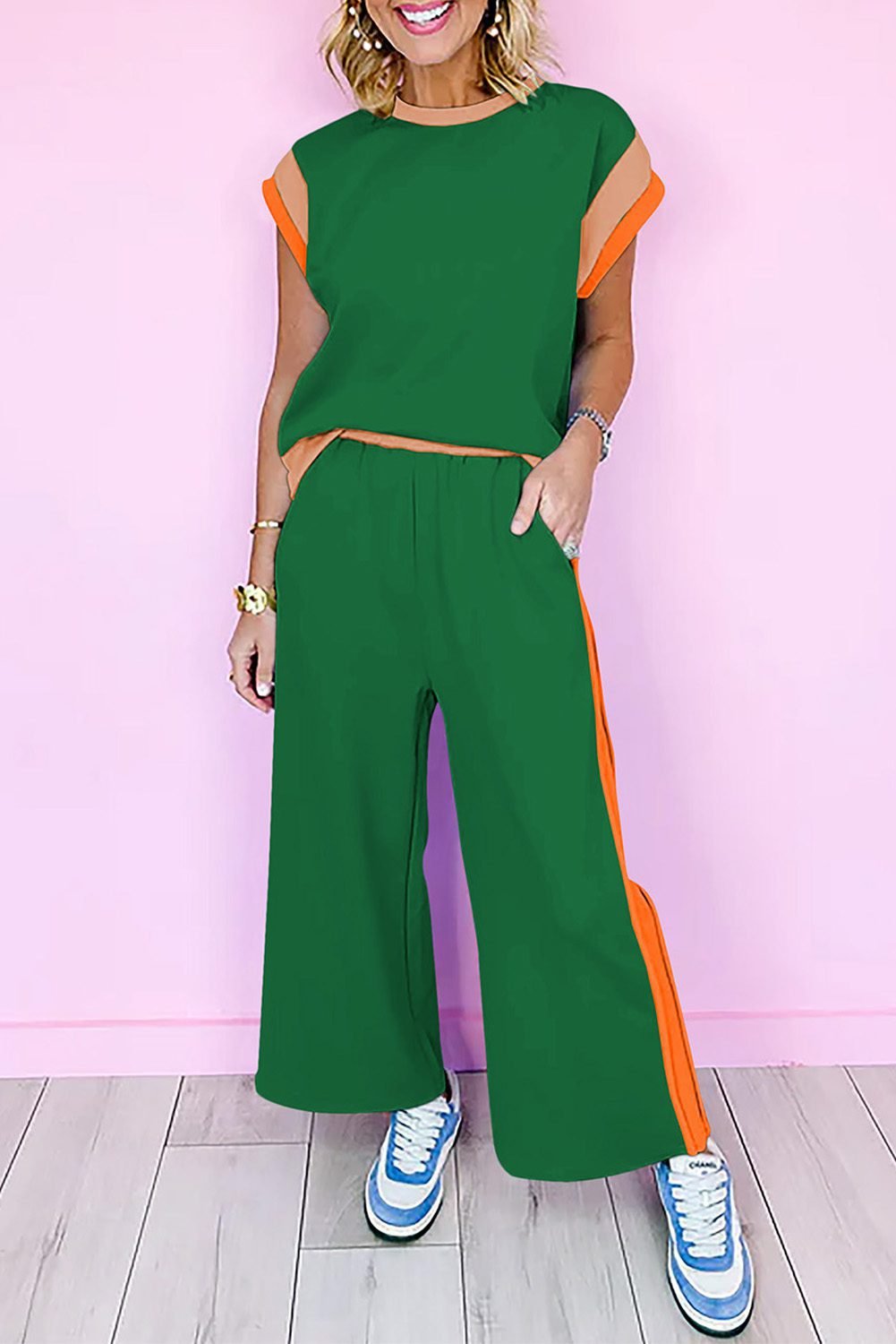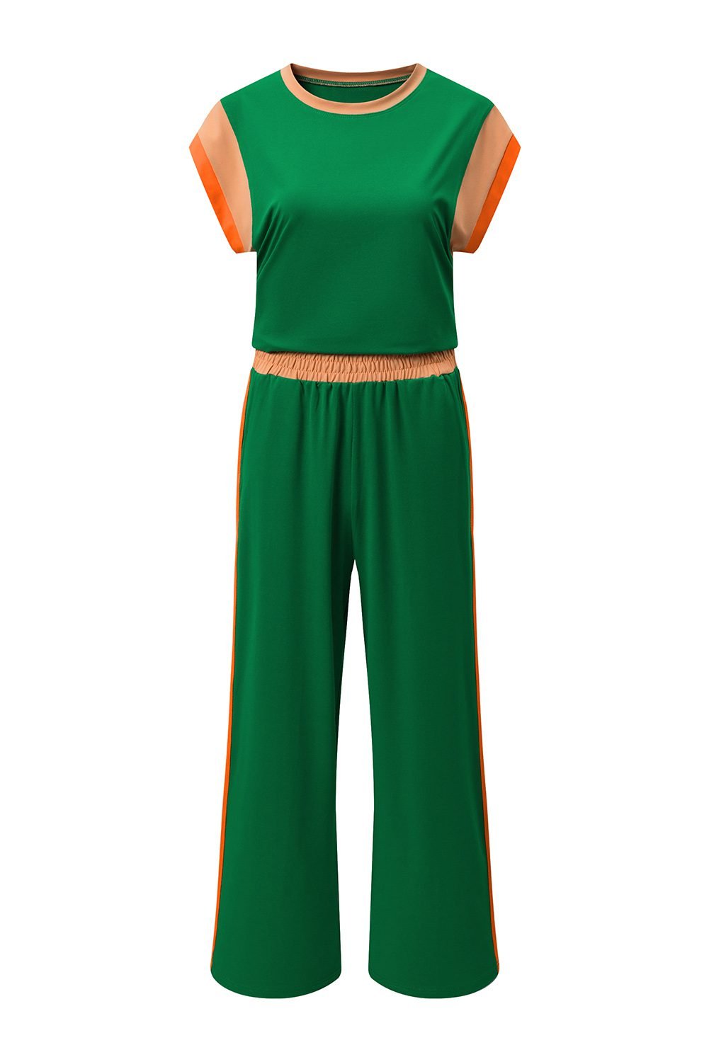 - Crew neck cap sleeve tee and crop wide leg pants included