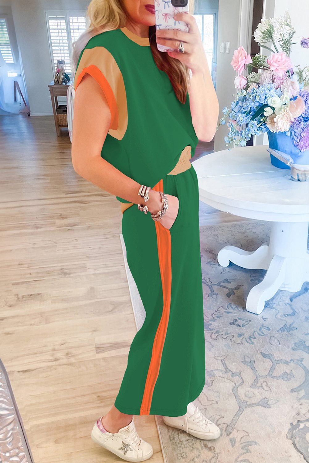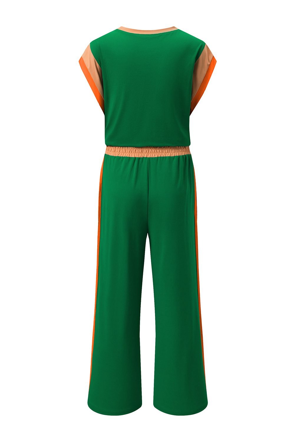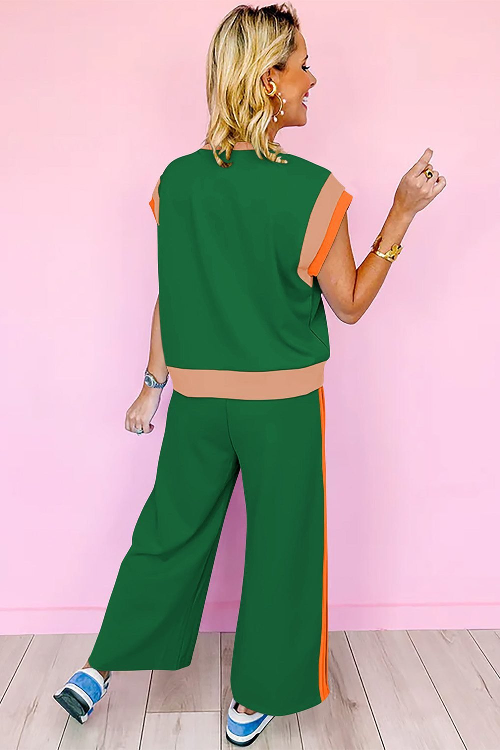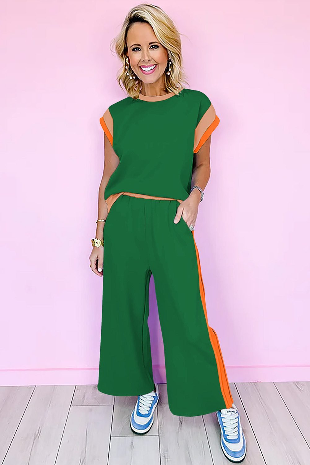- Crew neck cap sleeve tee and crop wide leg pants included