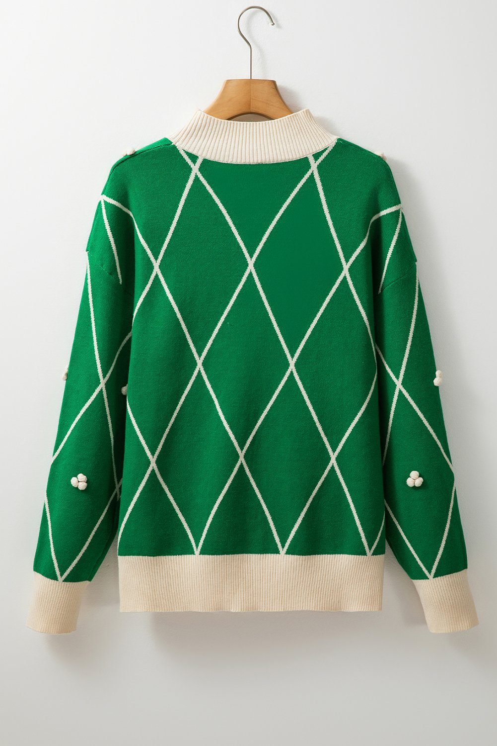 It features geometric diamond design with adorable pom-poms detail.