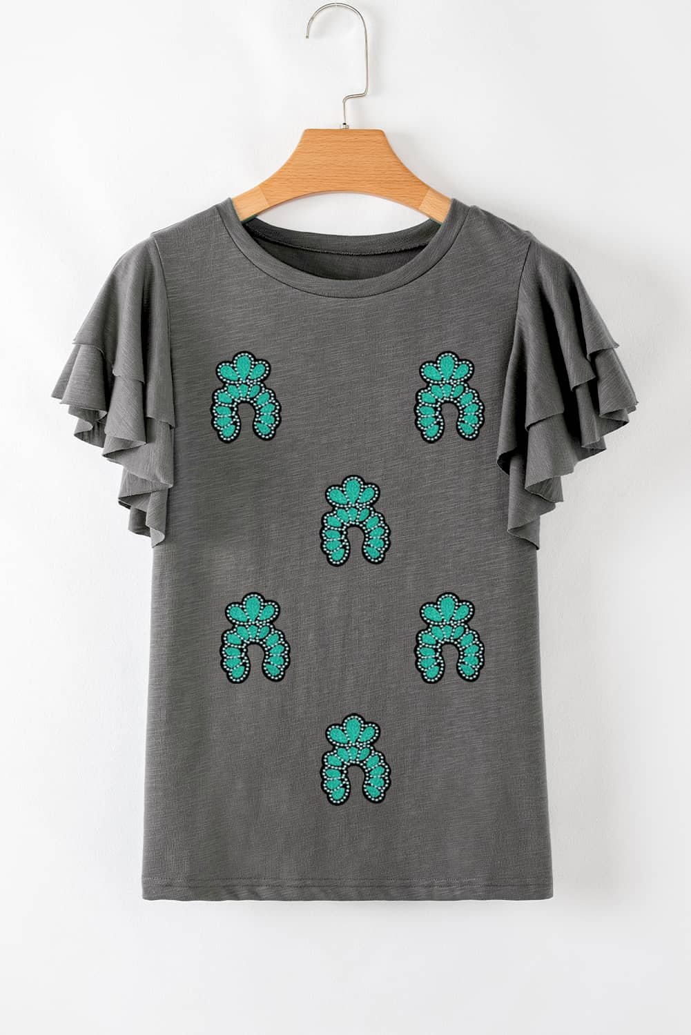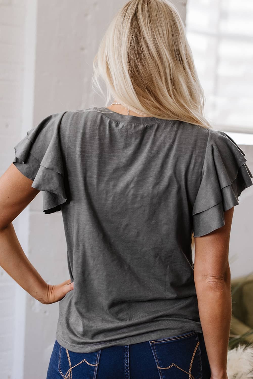 Features a round neck, short ruffle sleeves, and a relaxed fit.
