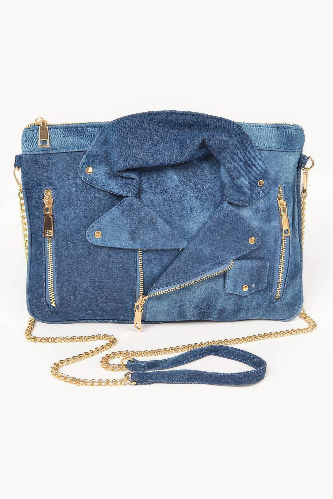 Add a touch of casual chic to your wardrobe with our Denim Jacket Crossbody Clutch. This versatile accessory combines the laid-back style of denim with the practicality of a crossbody bag, perfect for those who want a blend of fashion and function. Key Features: Fabric: Denim with mixed metal accents Fit: Compact yet spacious, designed to hold your essentials while keeping a sleek profile Color Options: Dark Blue, Light Blue Sizes: 13W9.5H0.75D Design: Featuring a denim texture with a stylish mixed metal clasp, the clutch transitions from a crossbody bag to an easy-to-carry clutch Versatile Styling: This Denim Jacket Crossbody Clutch is perfect for casual outings, night outs, or any occasion where you want to add a relaxed yet trendy touch to your outfit. The removable strap gives you the option to wear it as a clutch or as a crossbody bag for comfort. Product Details:Comfortable All-Day Wear: The adjustable strap allows you to wear this bag comfortably whether it’s slung across your body or carried as a clutch.Quality Craftsmanship: Crafted with durable denim and mixed metal details, this bag is designed to last while maintaining a stylish look. Why Choose Denim Jacket Crossbody Clutch The unique combination of denim and mixed metal accents offers a casual yet chic vibe, making it the perfect accessory for those who want to make a statement with minimal effort. Ideal Occasions: Perfect for casual get-togethers, nights out with friends, or as an easy and stylish option for running errands in style.