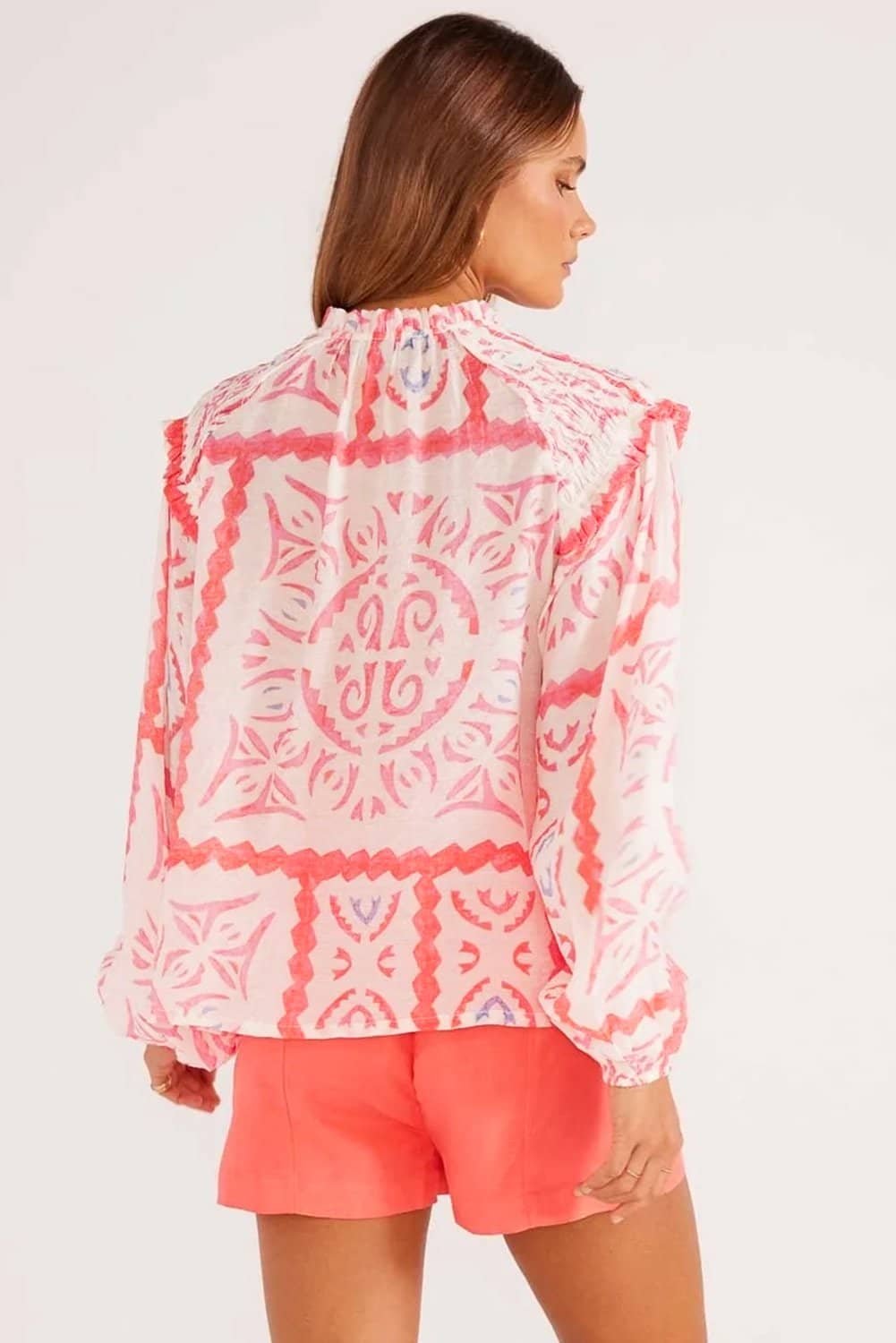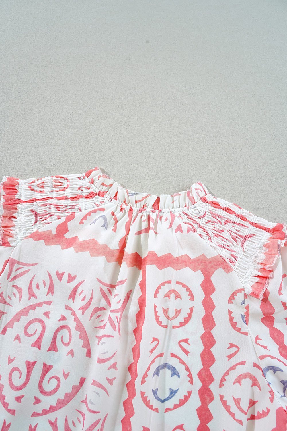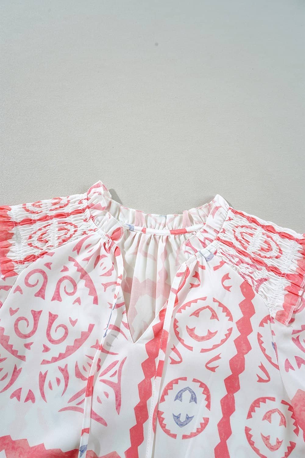Desert Flower Vintage Print Smocked Poet Collar Billowy Blouson Sleeves Blouse