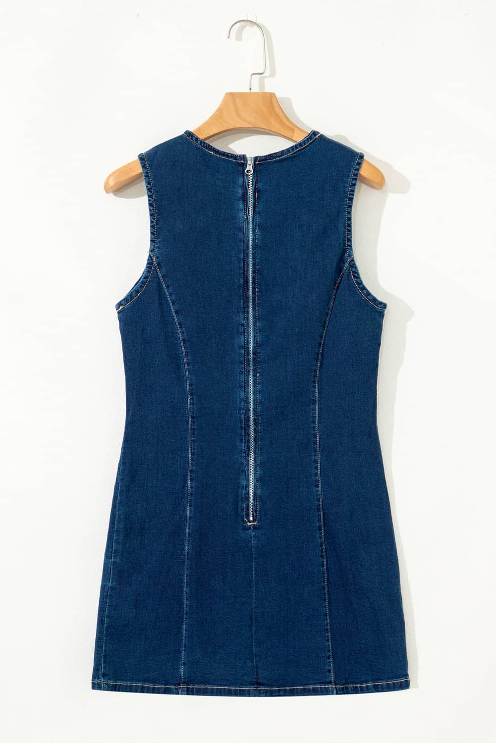 Seamed with a high neckline, sleeveless, and subtle slit.