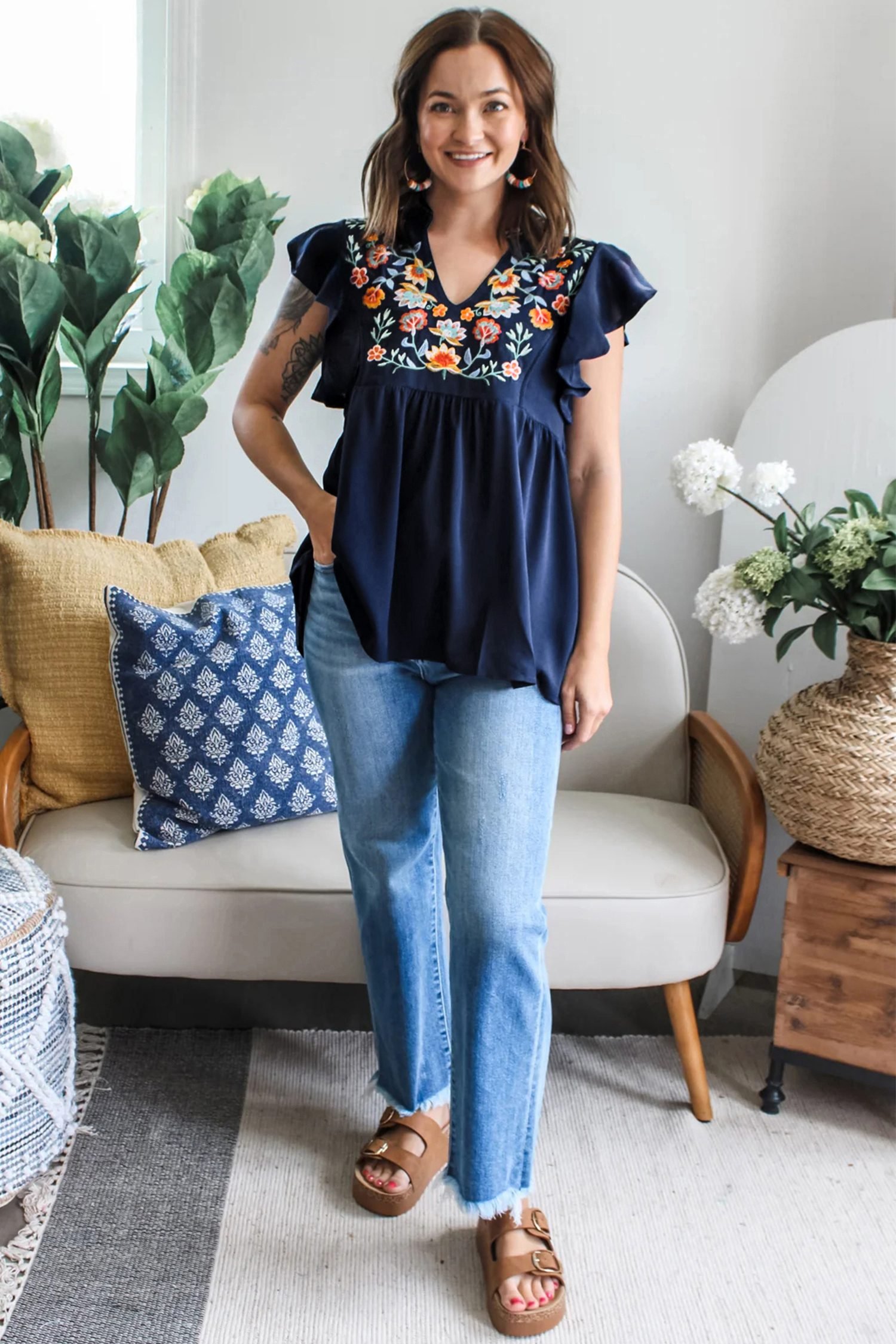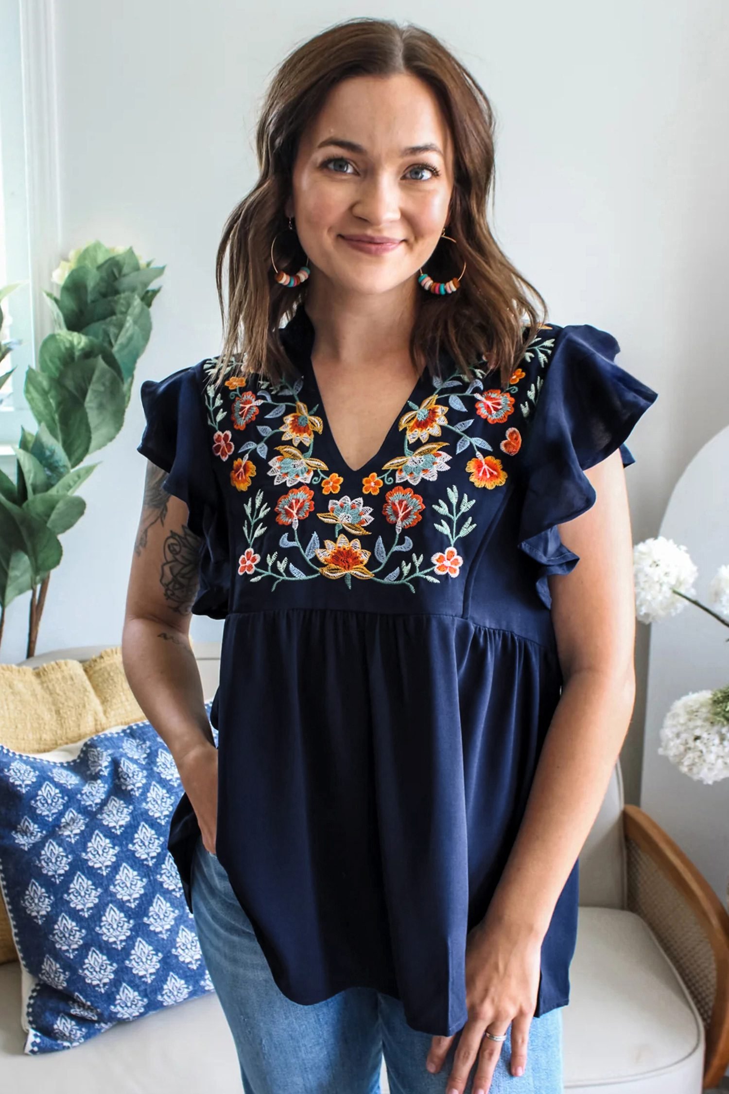 • The floral embroidered blouse is an elegant and sophisticated top.