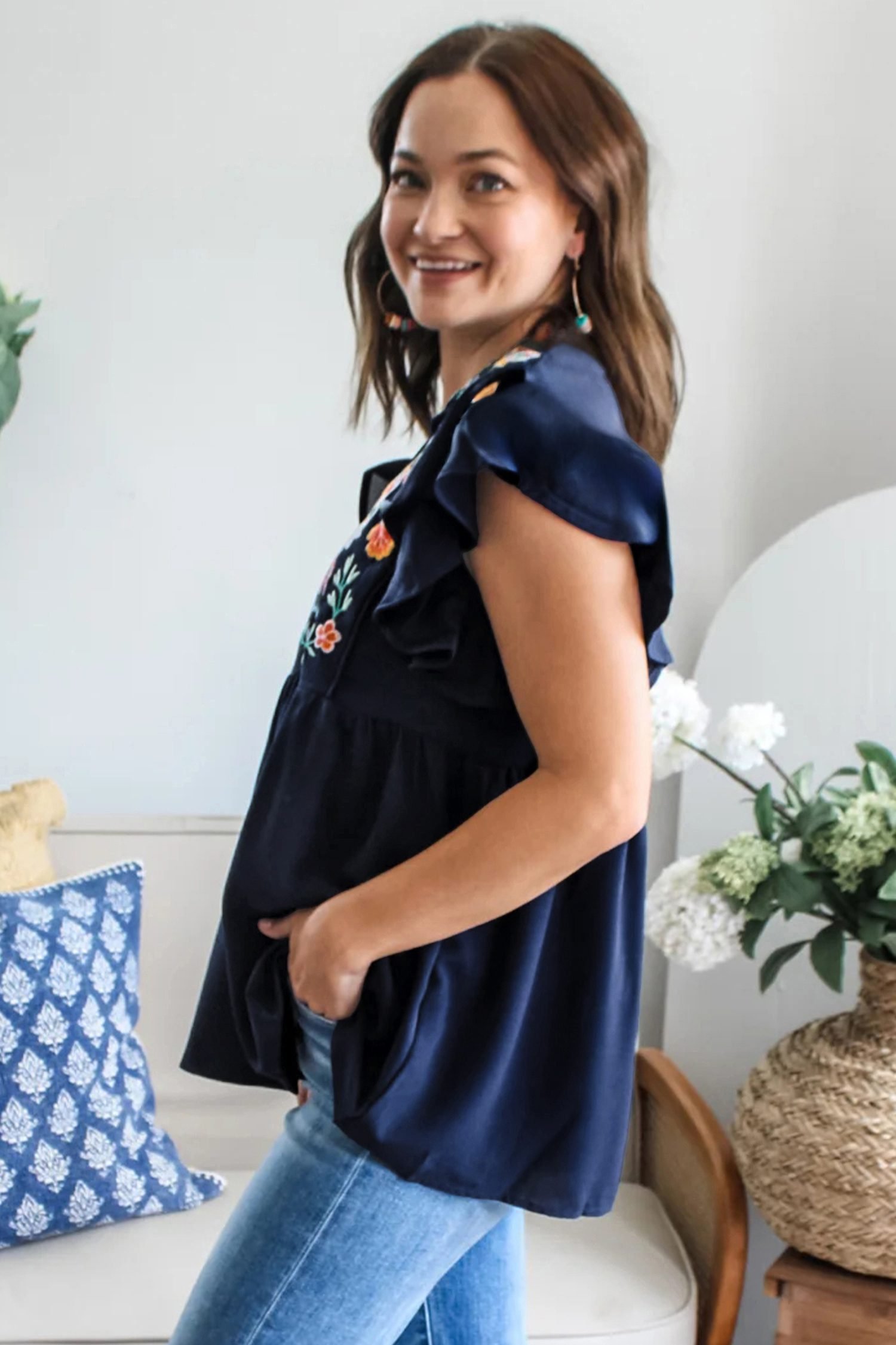 Dirty Blue V Neck Ruffled Sleeve Floral Embroidered Detail Babydoll Blouse