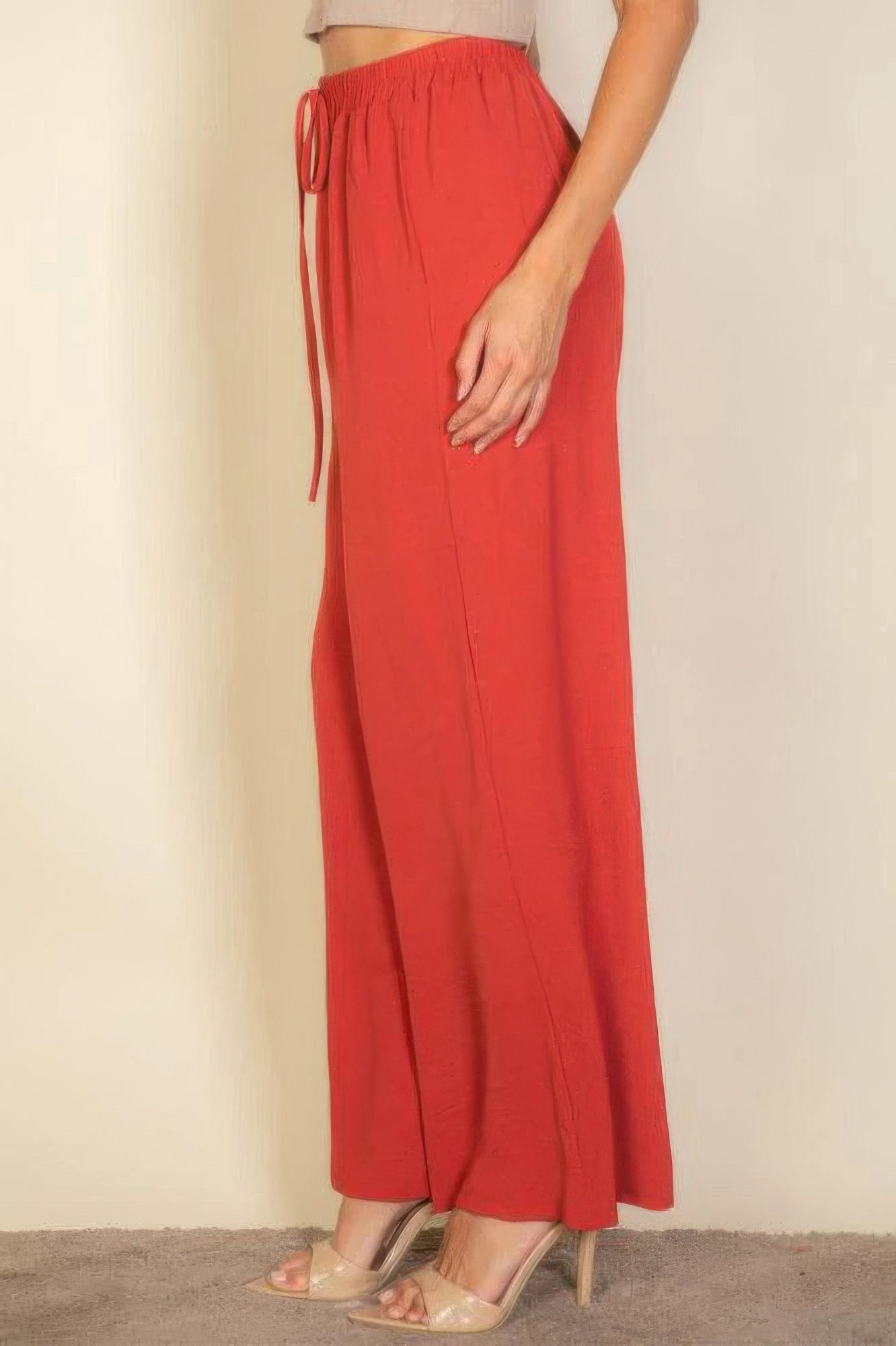 Elevate your casual wardrobe with our Drawstring Waist Wide Leg Minimalist Pants, a stylish and comfortable choice for everyday wear. Designed for versatility, these pants are perfect for lounging at home or running errands in style.Key Features: Fabric: Made from 100% polyester, these pants are skin-friendly and offer a soft, breathable feel for all-day comfort. Fit: Designed with a relaxed fit and a drawstring waist, allowing for a customizable fit that flatters various body shapes. Color Options: Available in a striking Burnt Orange shade, perfect for adding a pop of color to your outfit. Sizes: Offered in sizes S, M, and L to suit different body types. Design: Features a wide-leg style that provides a trendy look while ensuring ample room for movement. Versatile Styling: Ideal for loungewear, casual outings, or shopping trips, these pants can be effortlessly dressed up or kept casual with your favorite tops. Product Details: Comfortable All-Day Wear: Our Drawstring Waist Wide Leg Minimalist Pants are tailored for maximum comfort, allowing you to move freely throughout your day. Quality Craftsmanship: Each piece is expertly stitched to ensure durability and a perfect fit.Why Choose Drawstring Waist Wide Leg Minimalist Pants These pants stand out for their effortless blend of comfort and style, making them a wardrobe essential. The minimalist design allows for easy pairing with various tops and accessories, while the burnt orange color adds a trendy flair.Ideal Occasions: Perfect for relaxing at home, casual outings, or shopping trips, these pants are versatile enough to suit any relaxed setting.