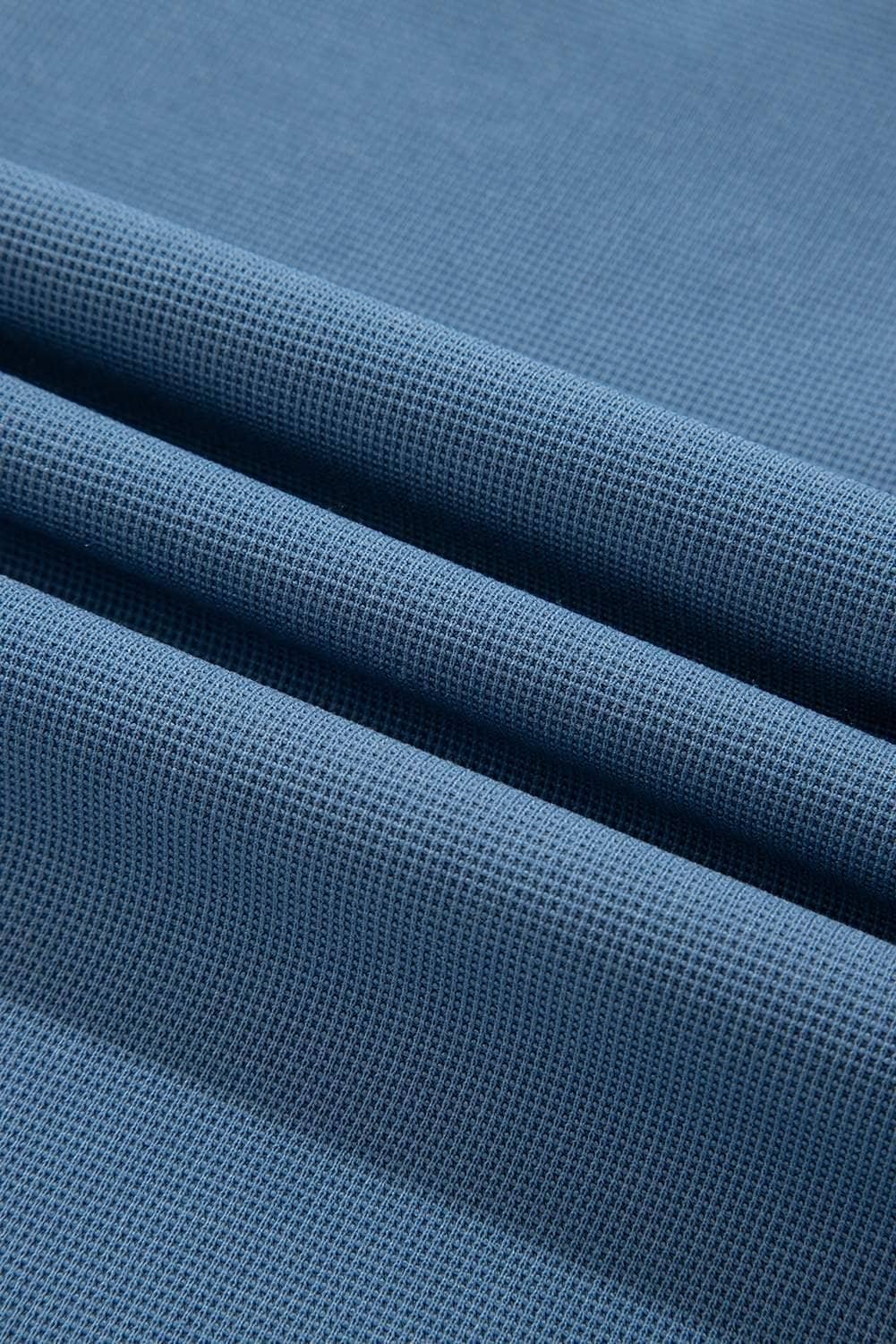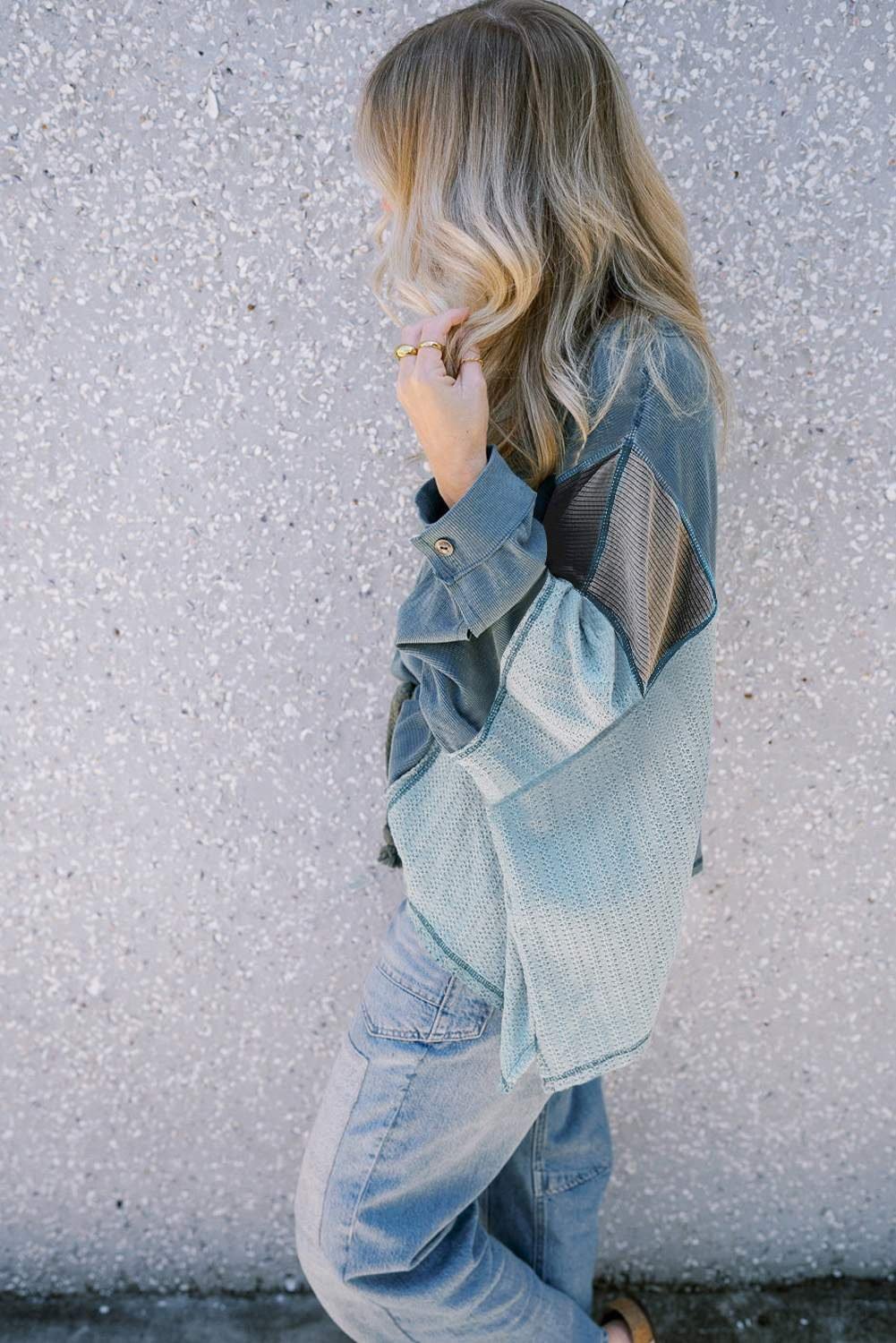 Dusk Blue Colorblock Stitching Patchwork Buttoned Long Sleeve Top