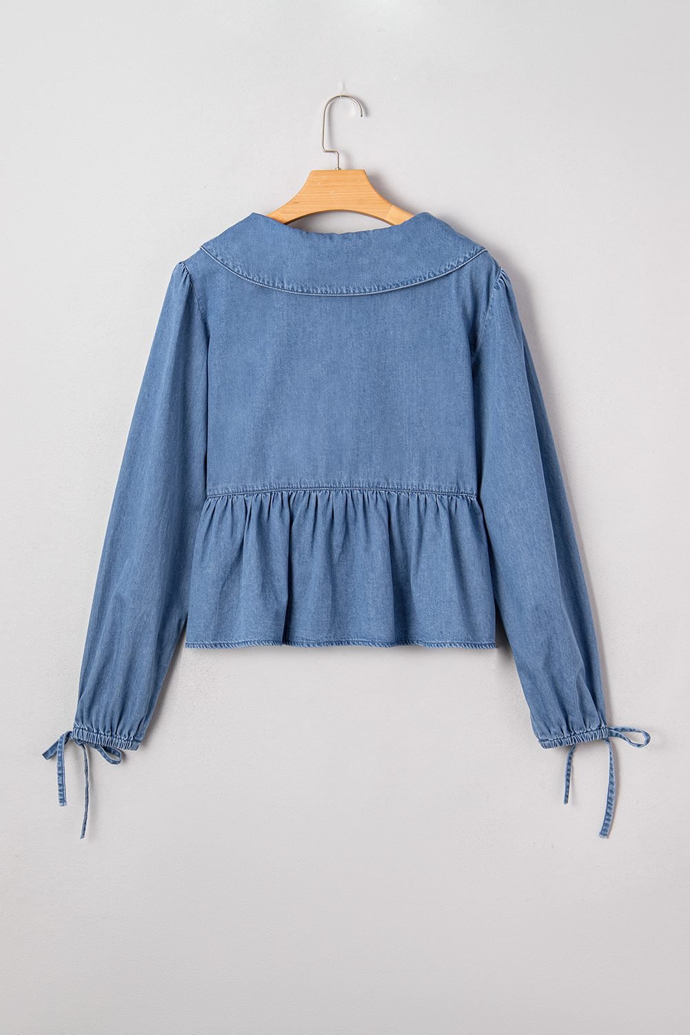 Dusk Blue Denim Lapel Neck Balloon Sleeve Tied Peplum Top