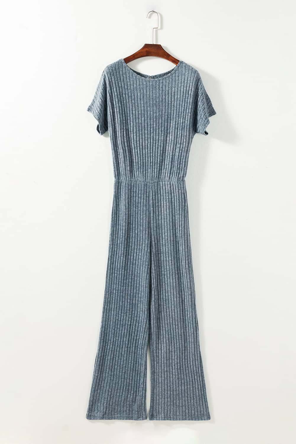 Dusk Blue Ribbed Keyhole Short Sleeve Wide Leg Jumpsuit