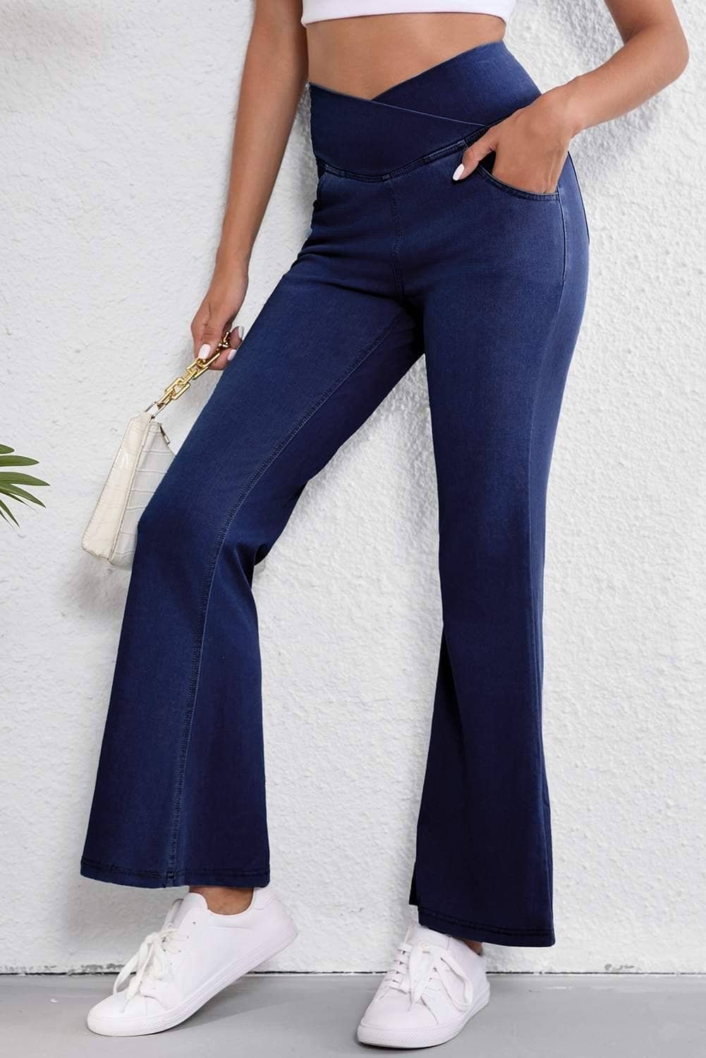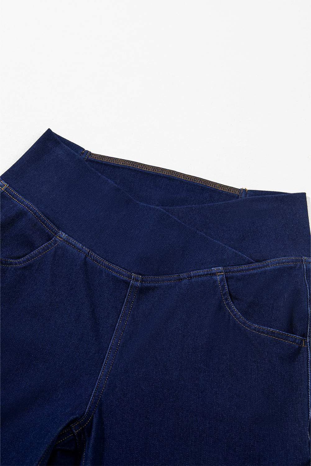 Be the first to review “Dusk Blue Solid Crossed Waist High Elastic Fit Flare Knit Jeans”