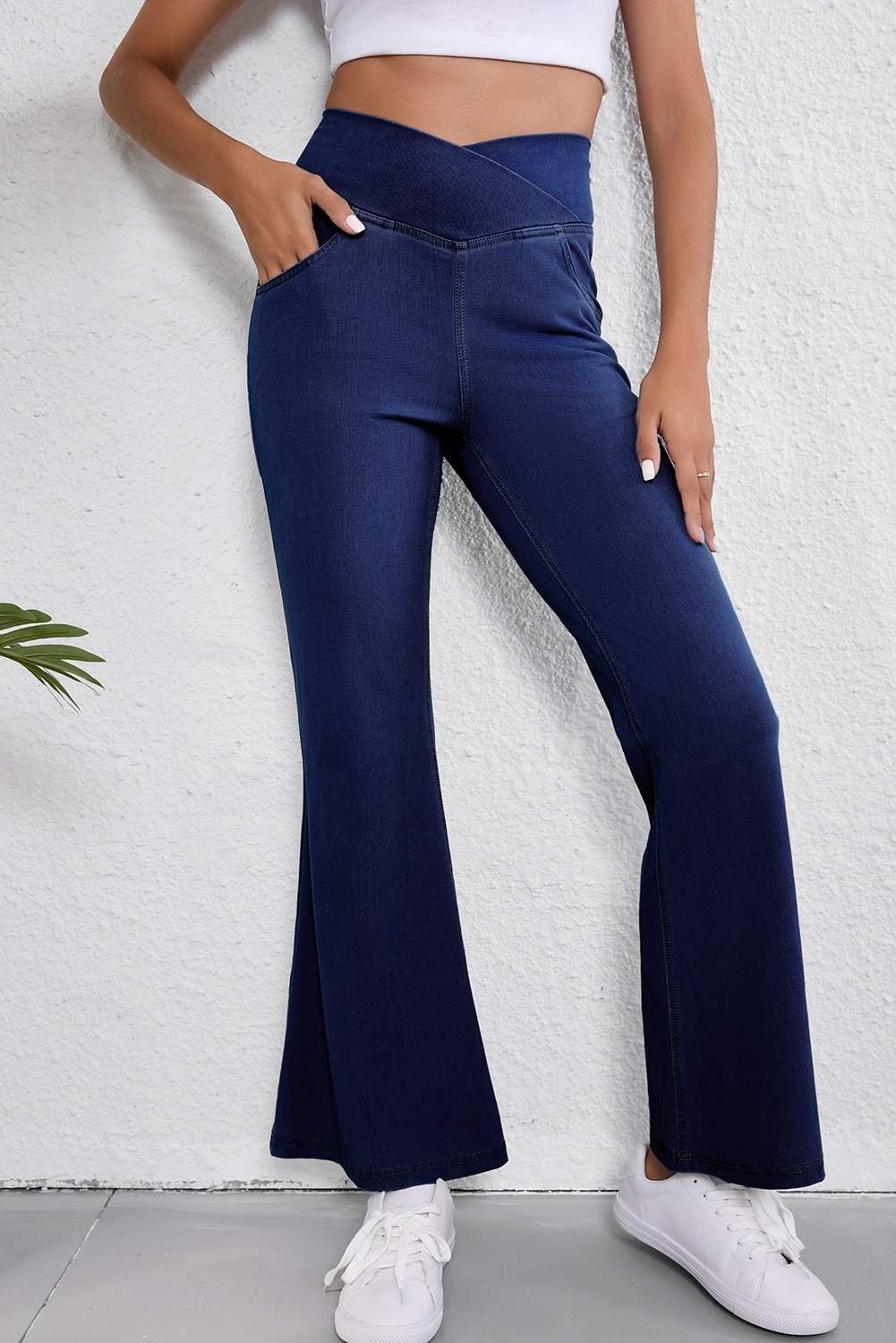 Dusk Blue Solid Crossed Waist High Elastic Fit Flare Knit Jeans