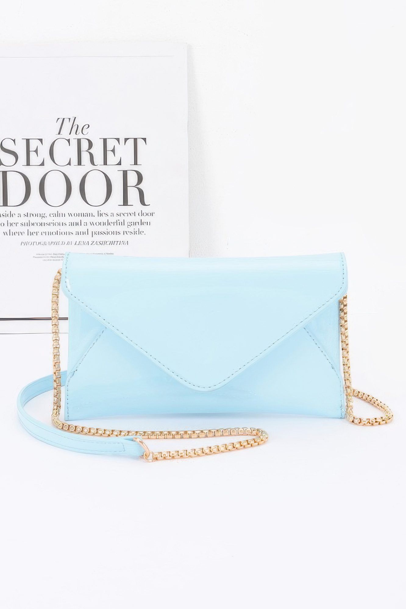 The Azure Elegance Clutch is a refined statement piece that brings sophistication and shine to any look. Crafted from sleek enamel-finished polyurethane and detailed with mixed metal hardware, this envelope-style clutch offers a polished silhouette in a compact design. Measuring 8 inches wide, 5 inches high, and 0.5 inches deep, it’s ideal for carrying your essentials without adding bulk. The chic chain strap allows for versatile styling, whether worn over the shoulder or carried as a clutch. Perfect for evenings out, special occasions, or when your outfit calls for a sleek finishing touch.