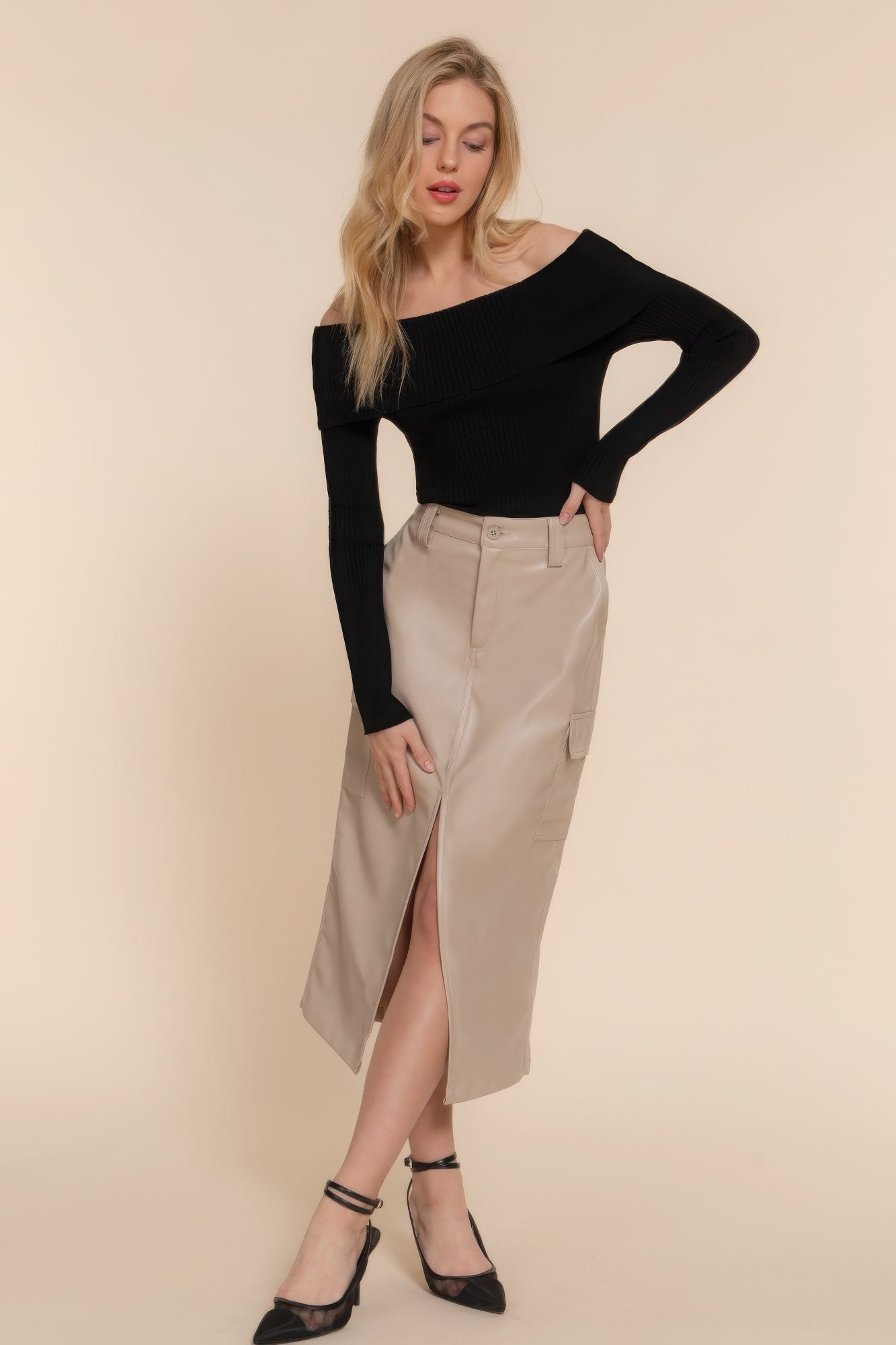 Elevate your wardrobe with our Faux Leather Midi Cargo Skirt in Dark Beige. This fashionable skirt blends the edgy appeal of faux leather with the practicality of cargo styling, creating a versatile piece that makes a statement in any setting.Key Features:- Fabric: 100% Polyurethane, providing a sleek faux leather finish that is durable and easy to care for.- Fit: Regular fit with a midi length for a sophisticated and flattering look.- Color Options: Dark Beige.- Sizes: Available in S, M, and L.- Design: The skirt features a smooth faux leather texture with a midi length and functional cargo pockets. The dark beige color adds a chic, neutral tone that enhances its versatility.- Versatile Styling: Ideal for pairing with both casual and dressy tops, this skirt can be dressed up or down for various occasions.Product Details:Comfortable All-Day Wear: Designed for style and comfort, the Faux Leather Midi Cargo Skirt ensures easy wear throughout the day.Quality Craftsmanship: Expertly crafted and quality-checked to meet high standards.Care Instructions: Wipe clean with a damp cloth or sponge; avoid machine washing or dry cleaning to maintain the product’s quality.Why Choose Faux Leather Midi Cargo SkirtThis skirt stands out with its elegant dark beige color and functional cargo pockets. The faux leather design and midi length offer both style and practicality, making it a versatile addition to any wardrobe.Ideal Occasions:Perfect for casual outings, office wear, or adding a trendy edge to your everyday look.