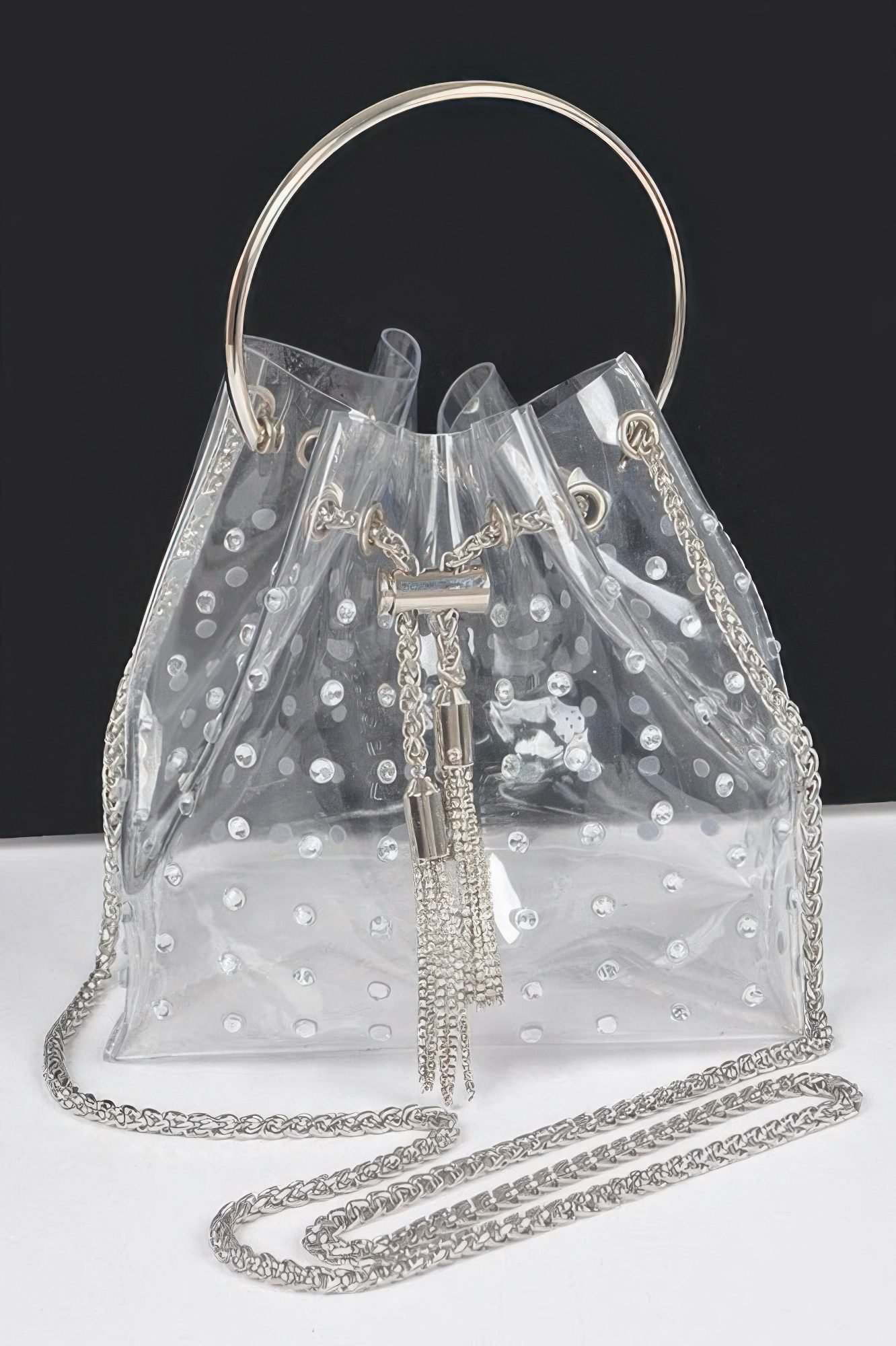 Product Description: This faux pearl studded bucket bag delivers a refined statement with a modern silhouette. Designed with pearl embellishments throughout, it adds texture and visual interest from every angle. The structured bucket shape offers a balance of elegance and functionality. A sleek metal handle enhances the polished look while providing comfortable carry. Compact yet roomy enough for essentials, it transitions easily from day to evening wear. Durable materials ensure lasting structure and style. This bag is a standout accessory designed to elevate any outfit effortlessly. Product Details: Faux pearl studded exterior Structured bucket bag silhouette Metal top handle design Dimensions: 7W x 7.5H x 4.5D inches PVC, rhinestone, and mixed metal materials Size Guide: For accurate sizing guidance, please review our size chart available on the website. Shipping and Returns: Fast Shipping: We offer speedy delivery to your doorstep. Hassle-Free Returns: If you’re not completely satisfied, our flexible return policy ensures your peace of mind.