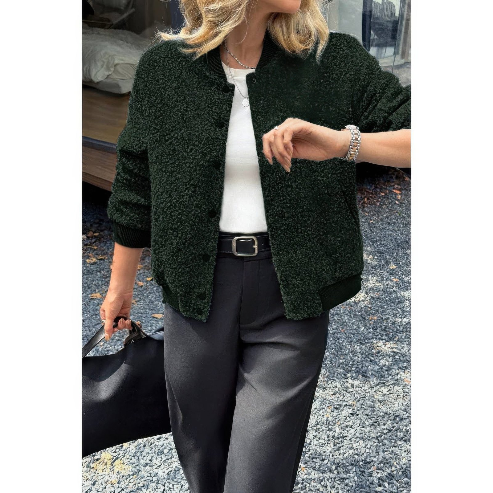 Product Description: Stay warm and stylish in the Faux Sherpa Fuzzy Teddy Bomber Jacket. Made from ultra-soft polyester, this cozy piece combines plush comfort with a modern bomber silhouette. Perfect for layering, it adds texture and warmth to any casual look. Whether you’re heading out for errands, a stroll, or a coffee date, this fuzzy jacket offers effortless charm and functionality. Its relaxed fit and durable construction make it an essential cold-weather staple. Product Details: Material: 100% Polyester Soft faux sherpa texture for plush comfort Classic bomber silhouette with ribbed trim Ideal for casual, daily, or outdoor wear Made in the USA Size Guide: For accurate sizing guidance, please review our size chart available on the website. Shipping and Returns: Fast Shipping: We offer speedy delivery to your doorstep. Hassle-Free Returns: If you’re not completely satisfied, our flexible return policy ensures your peace of mind.