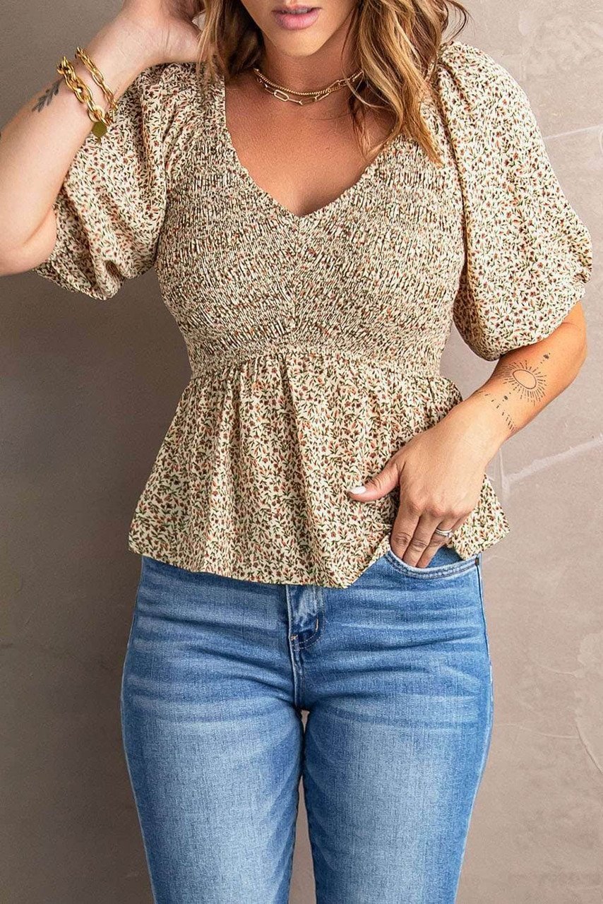 •V neck top has puff sleeve, smocked design with a peplum waist