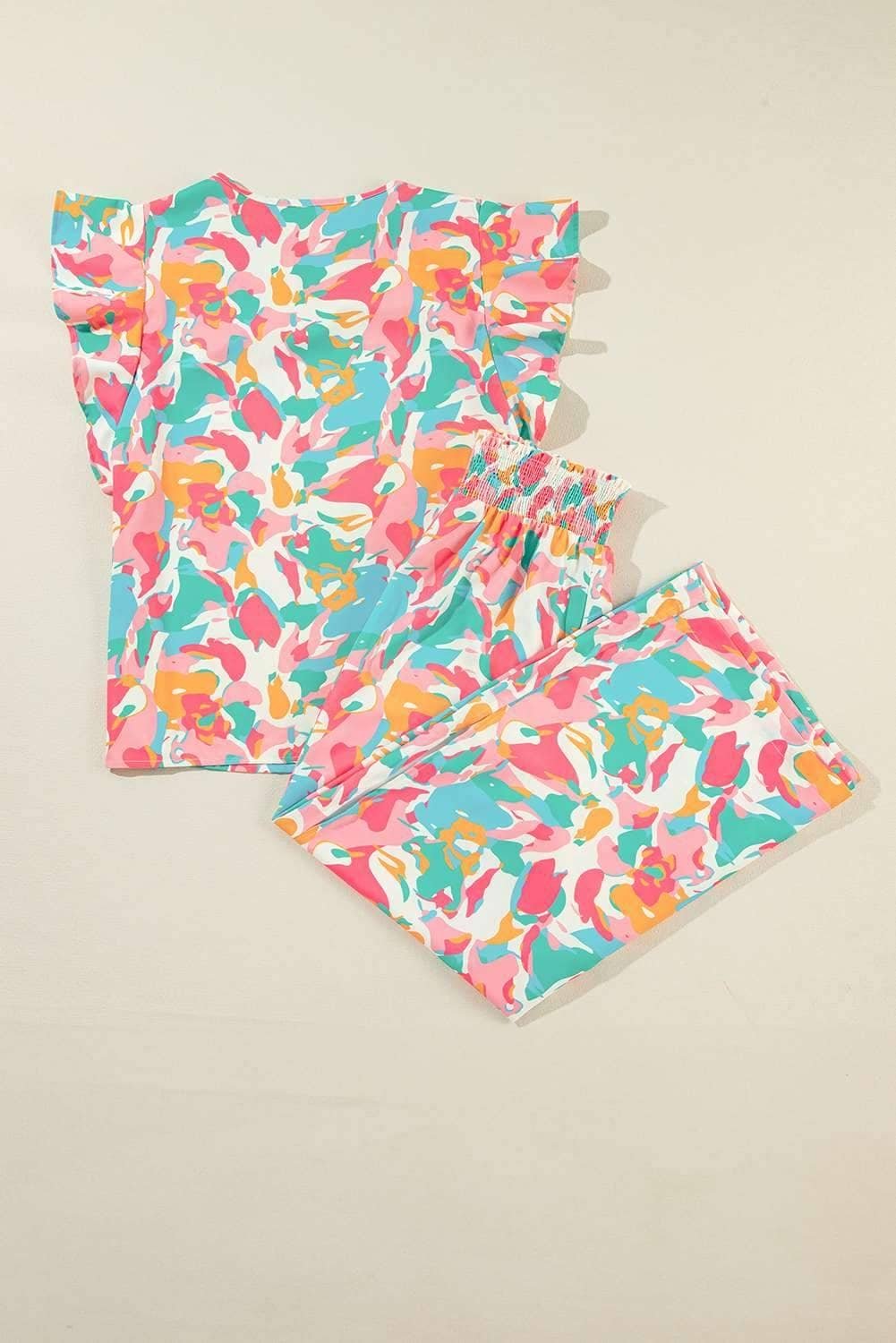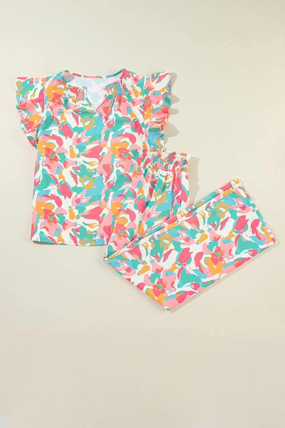 Floral Ruffled Sleeve Top Smocked Wide Leg Pants Set