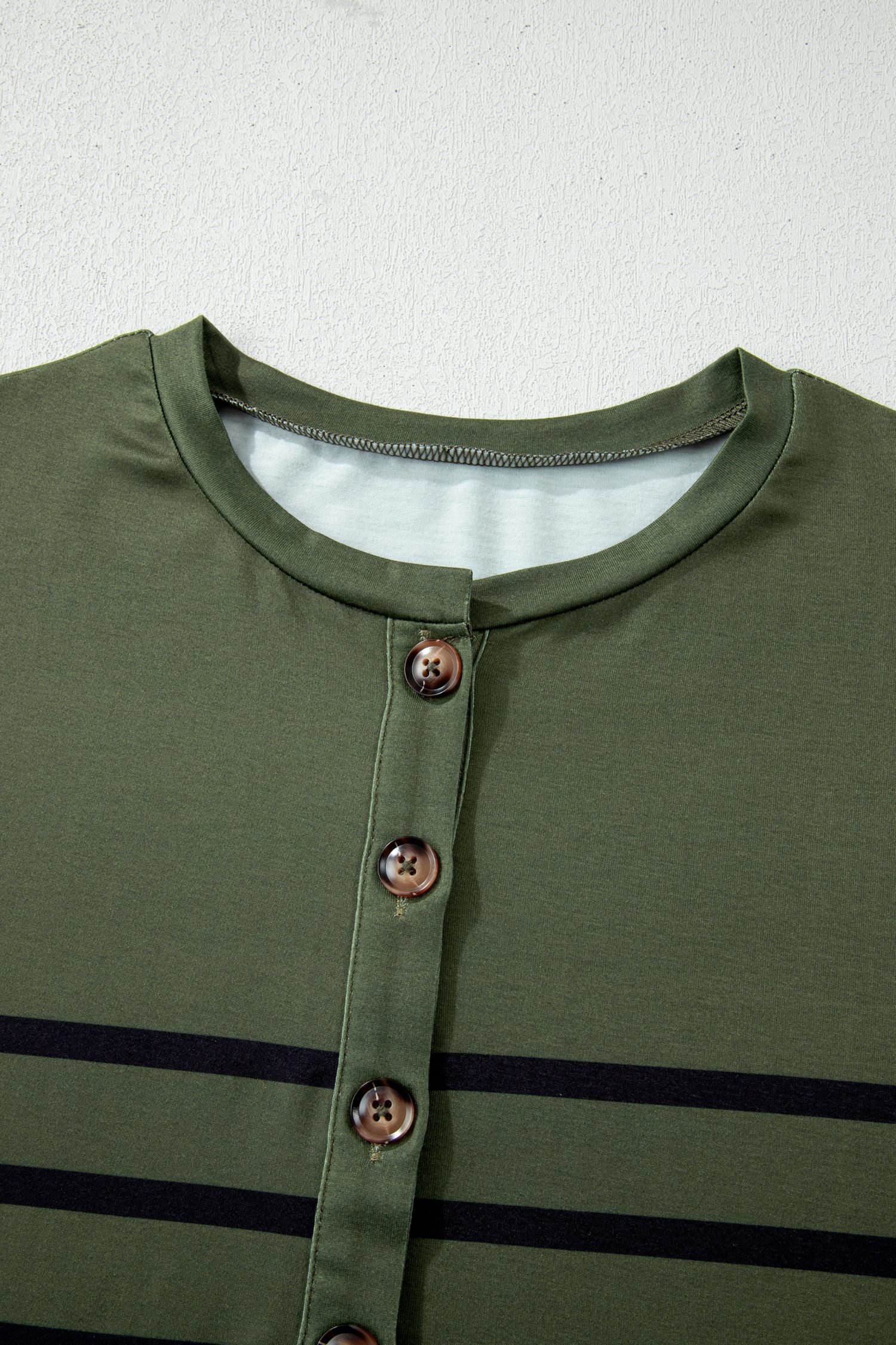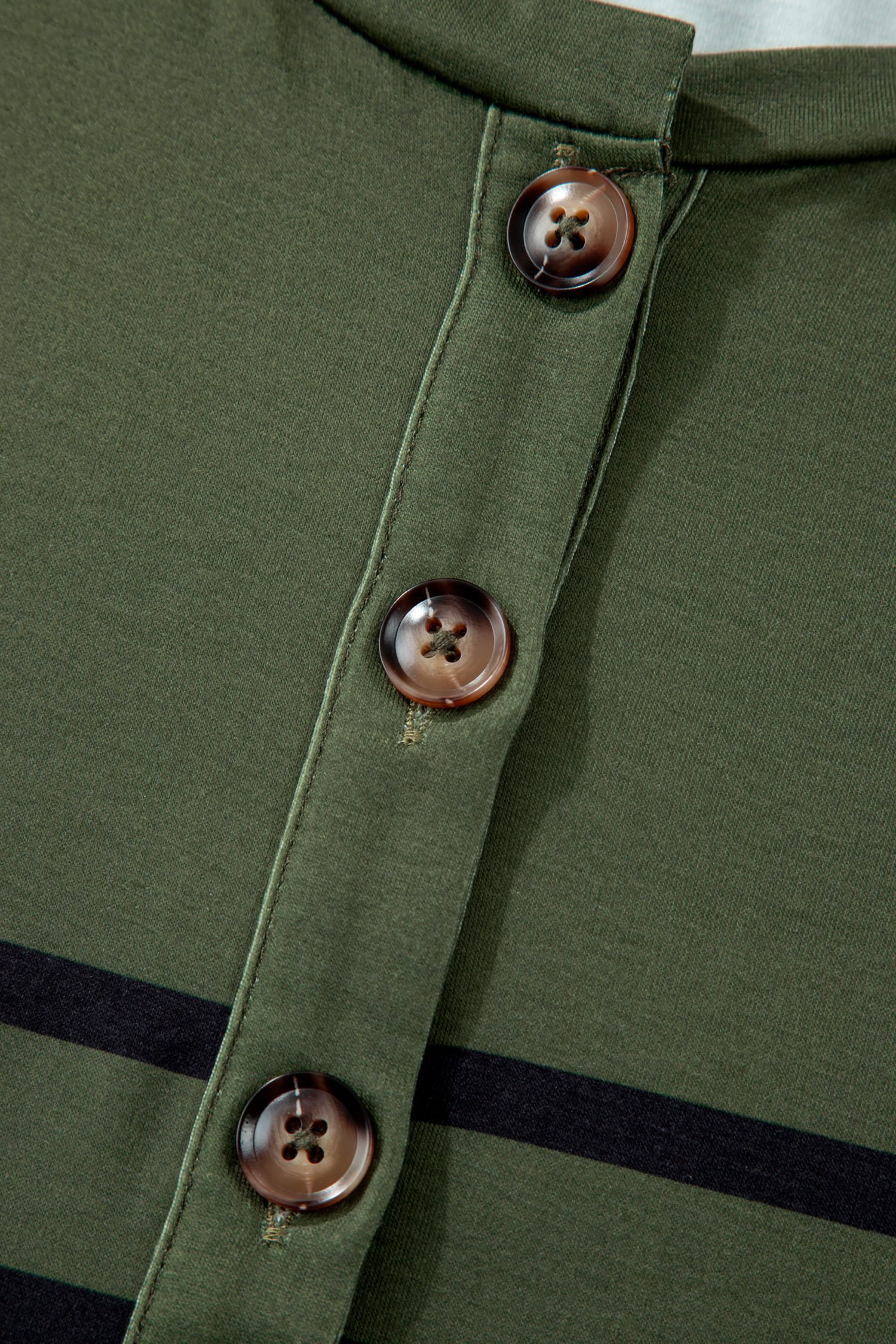 Classic striped T-shirt with half buttons adds a polished casual touch.