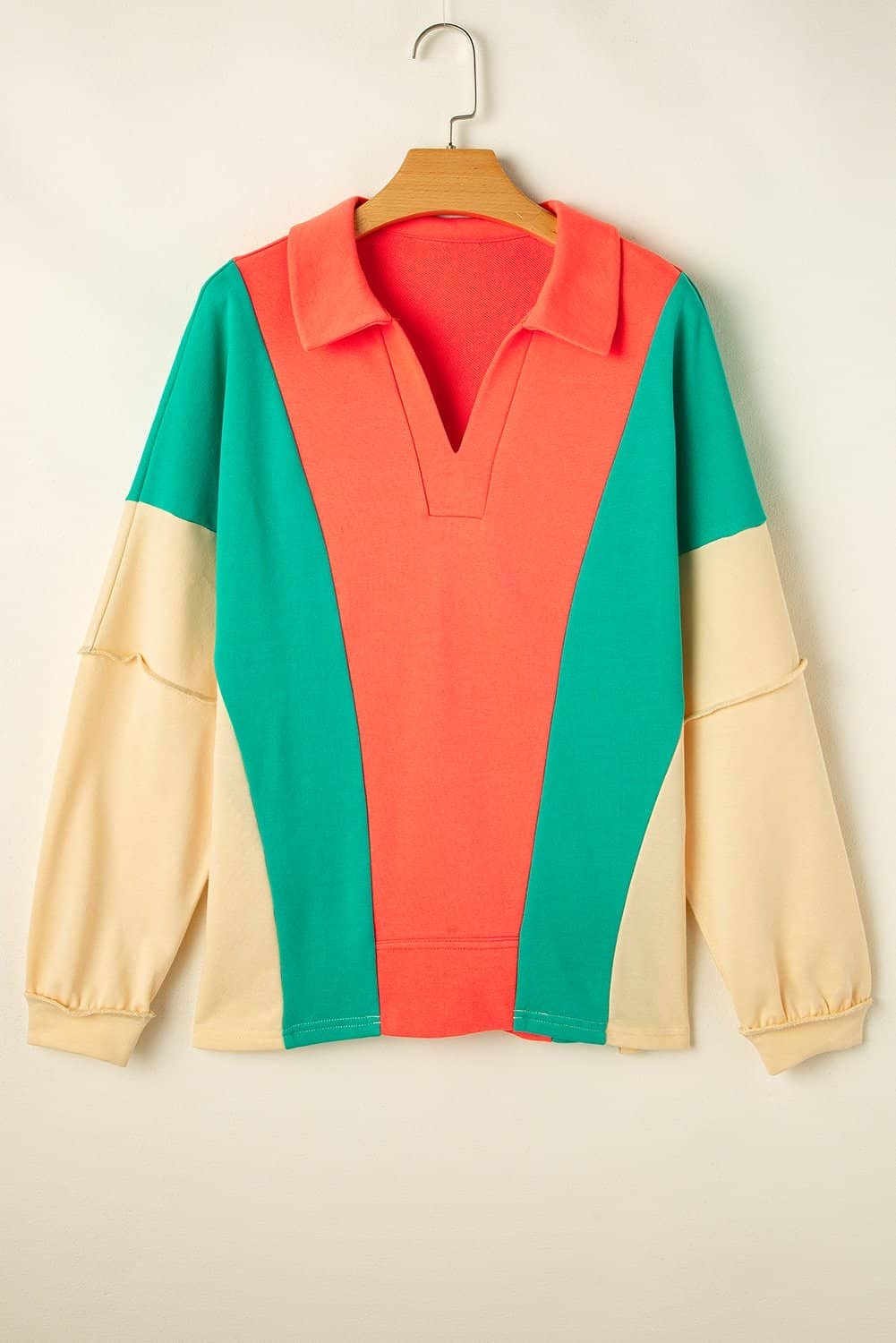 Be the first to review “Grapefruit Orange Color Block Patchwork Collared V Neck Loose Top”
