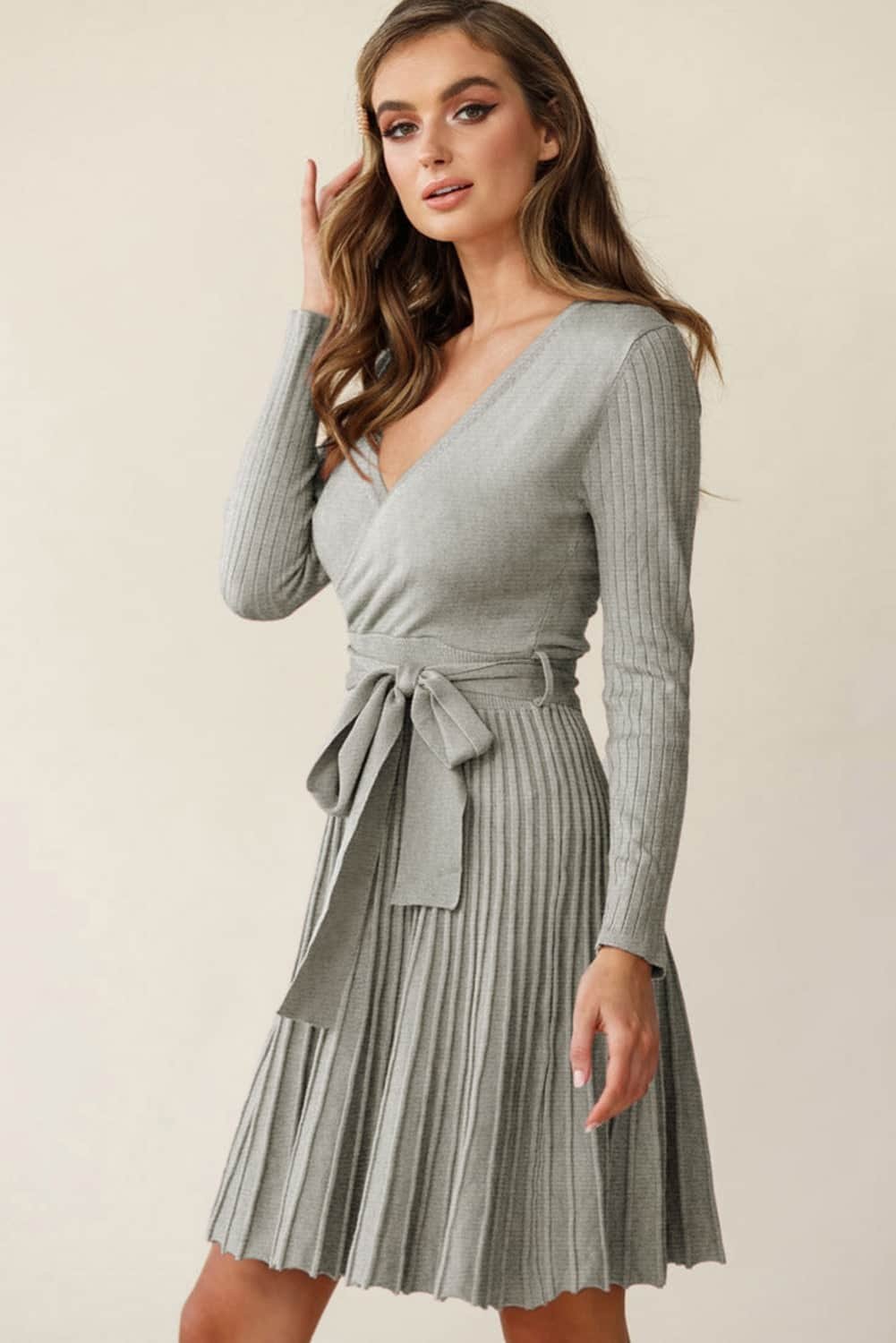 - This V-neck sweater dress provides a flattering and elongating effect