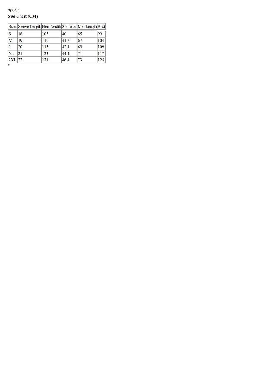 Sizes | Sleeve Length | Hem Width | Shoulder | Mid Length | Bust |