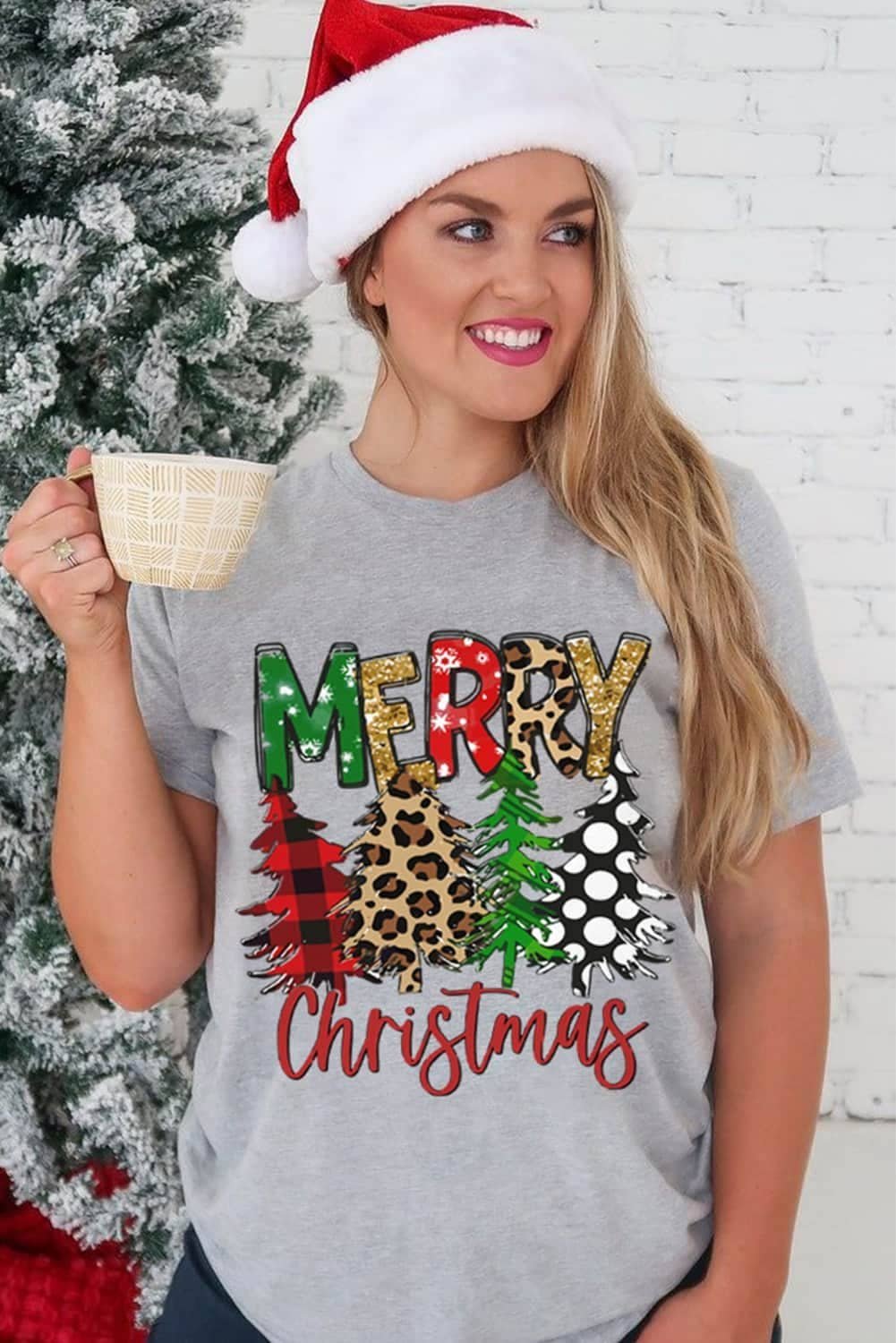 Merry Christmas Tree Pattern Print Crew Neck Graphic Tee