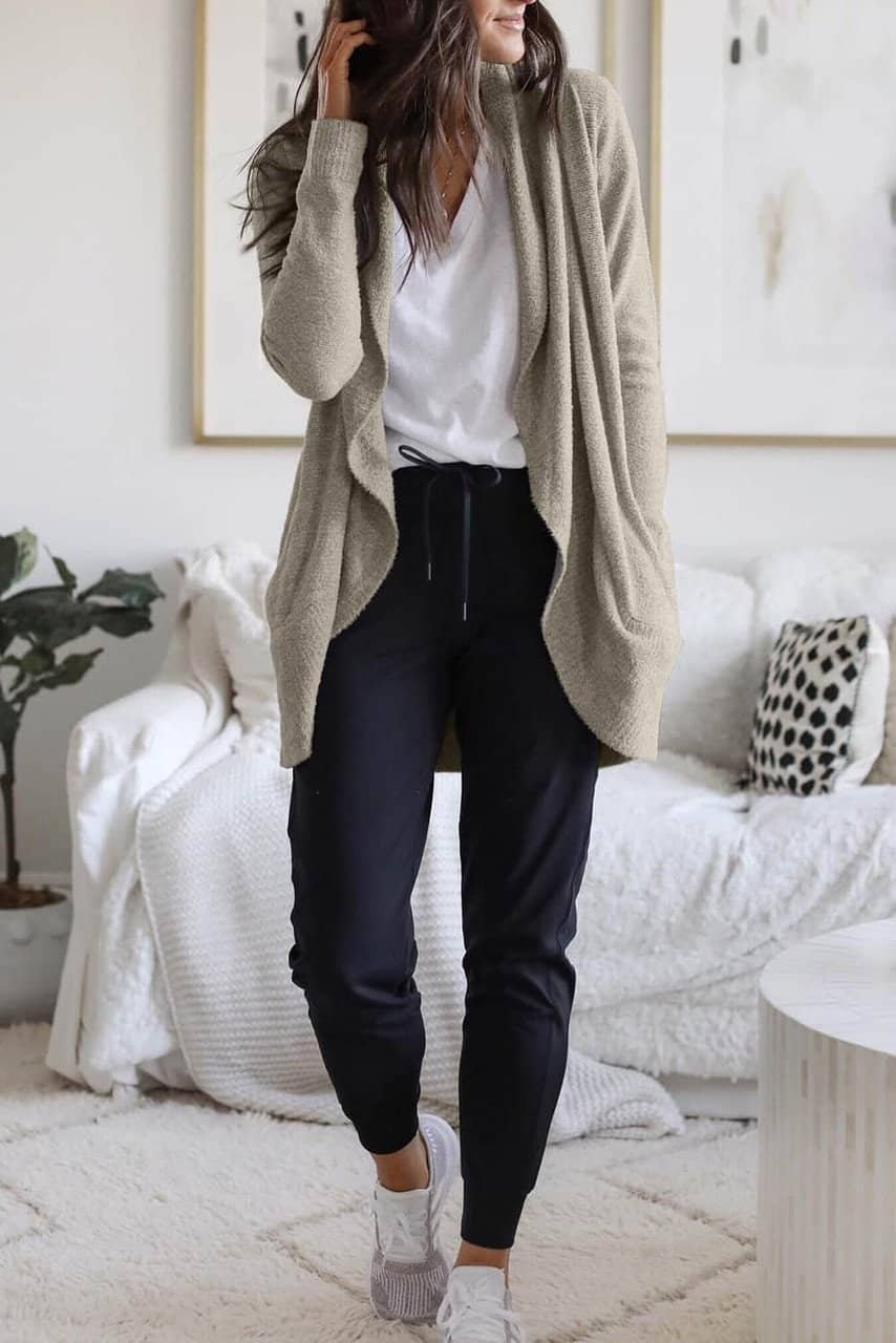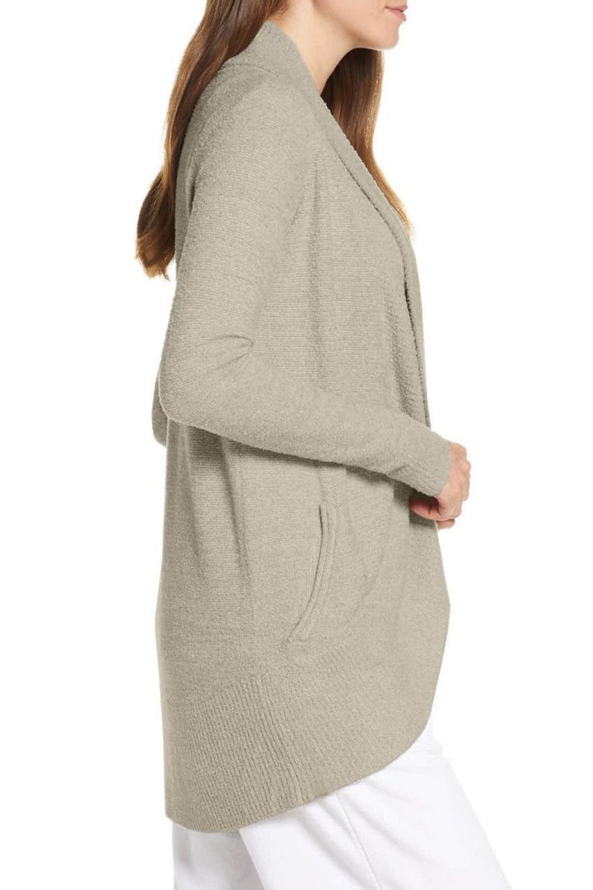 - A soft and lightweight knit enriches the comfort of a long lounge cardigan that keeps you cozy around the house or out on errands