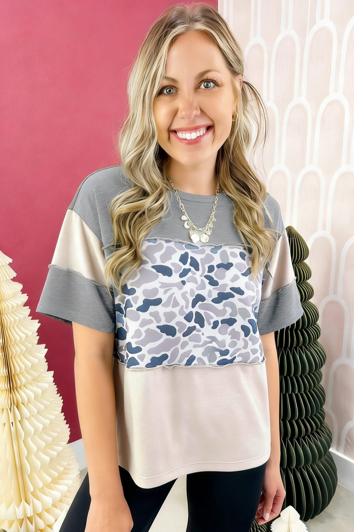 Unleash your wild side with this playful camo colorblock tee.