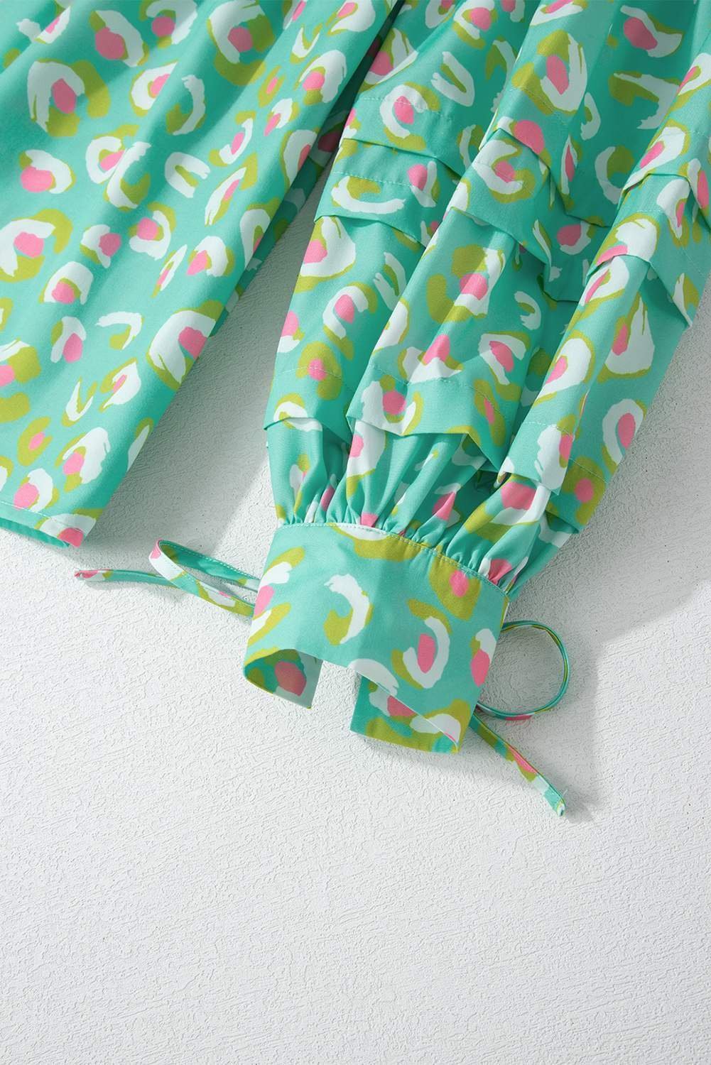 The blouse boasts voluminous lantern sleeves that provide a dramatic and elegant silhouette.