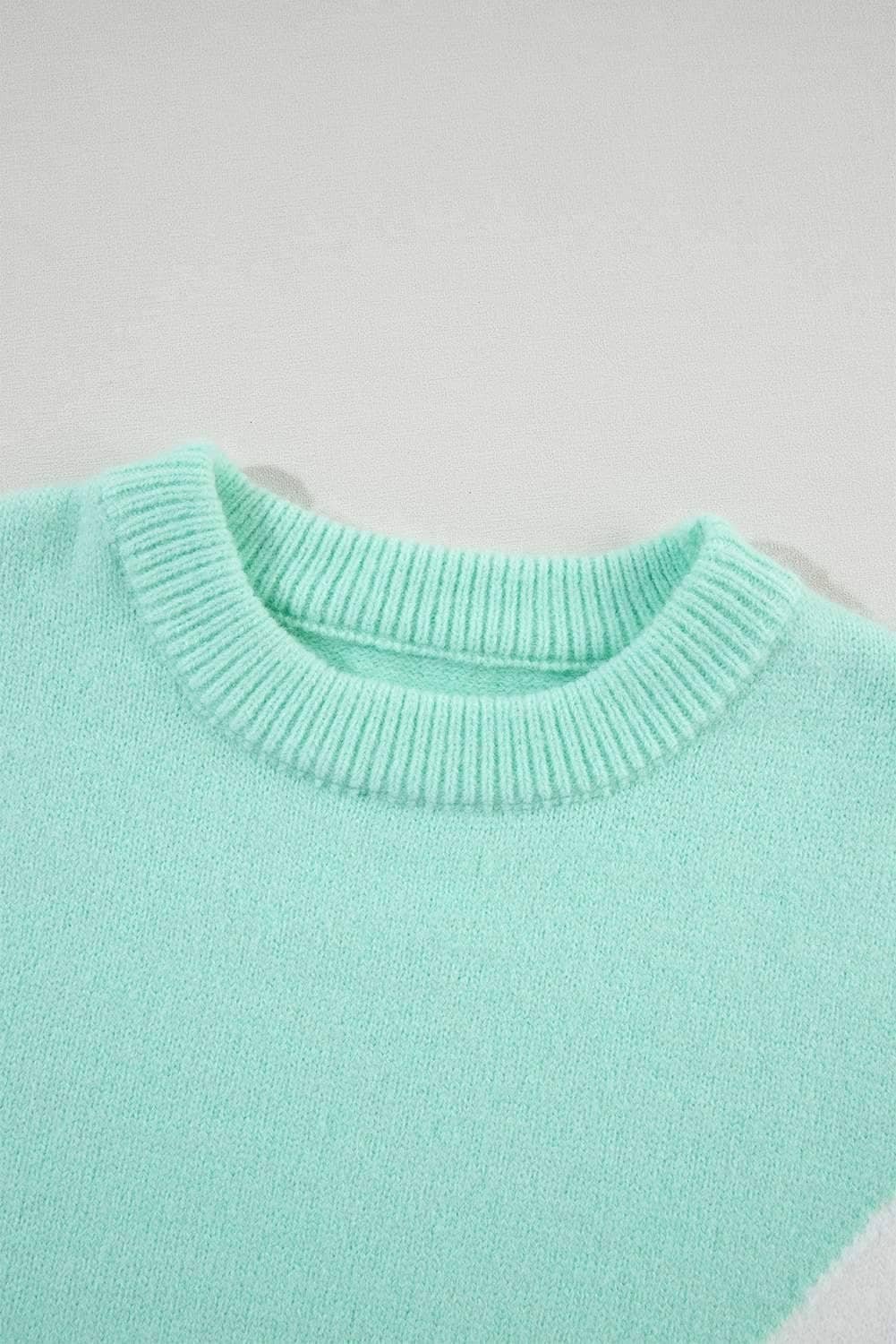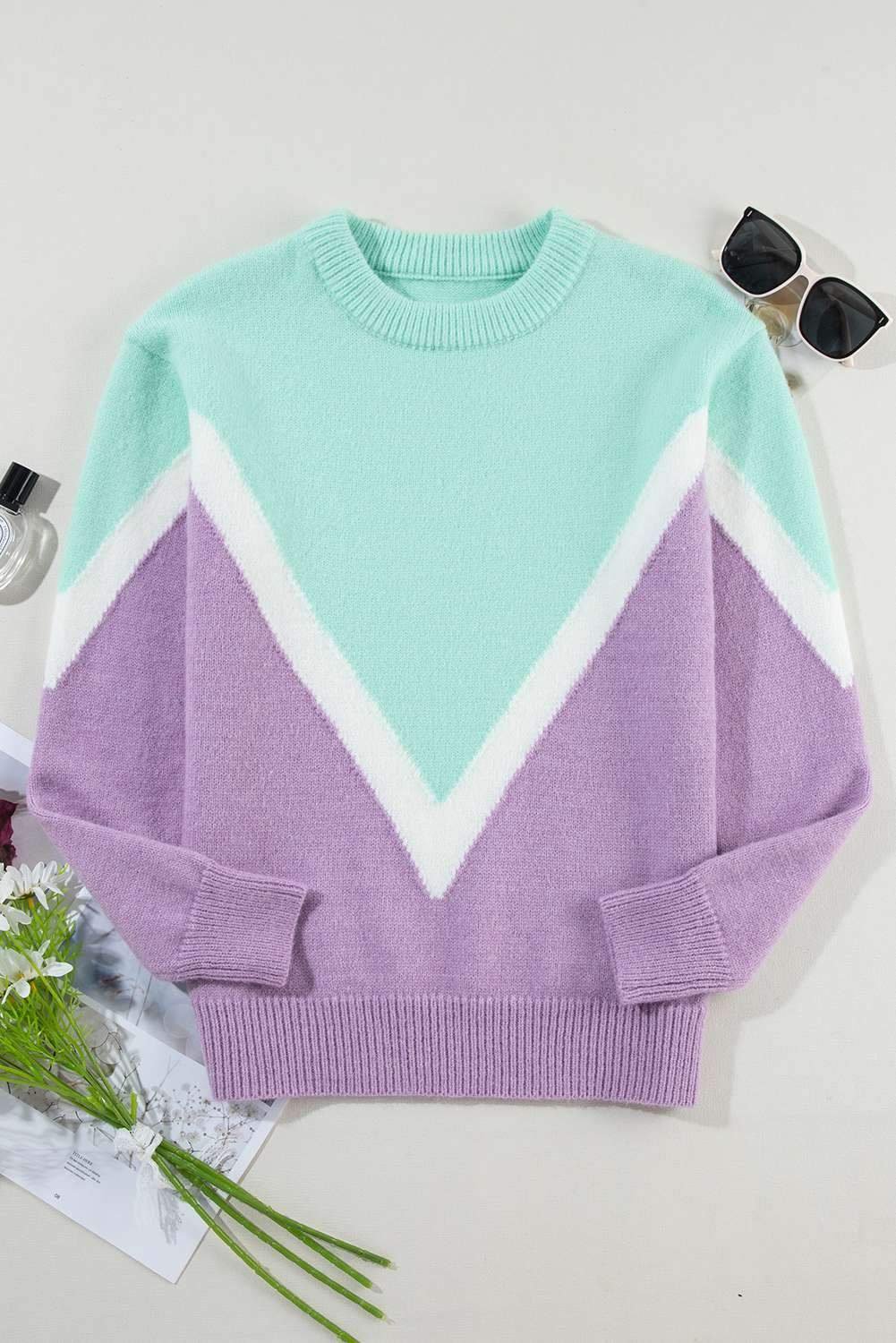 Green Chevron Colorblock Ribbed Knit Drop Shoulder Sweater