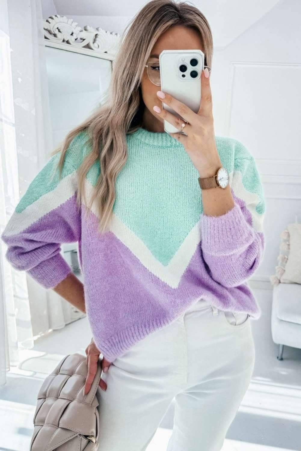 • This colorblock sweater adds a modern twist to your outfit.