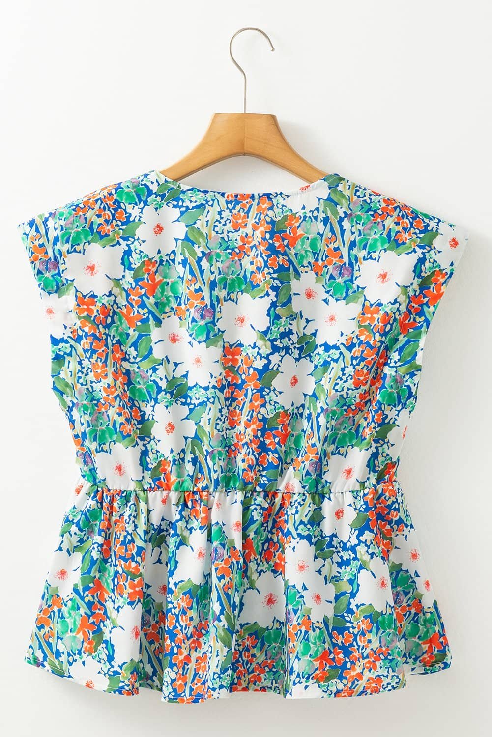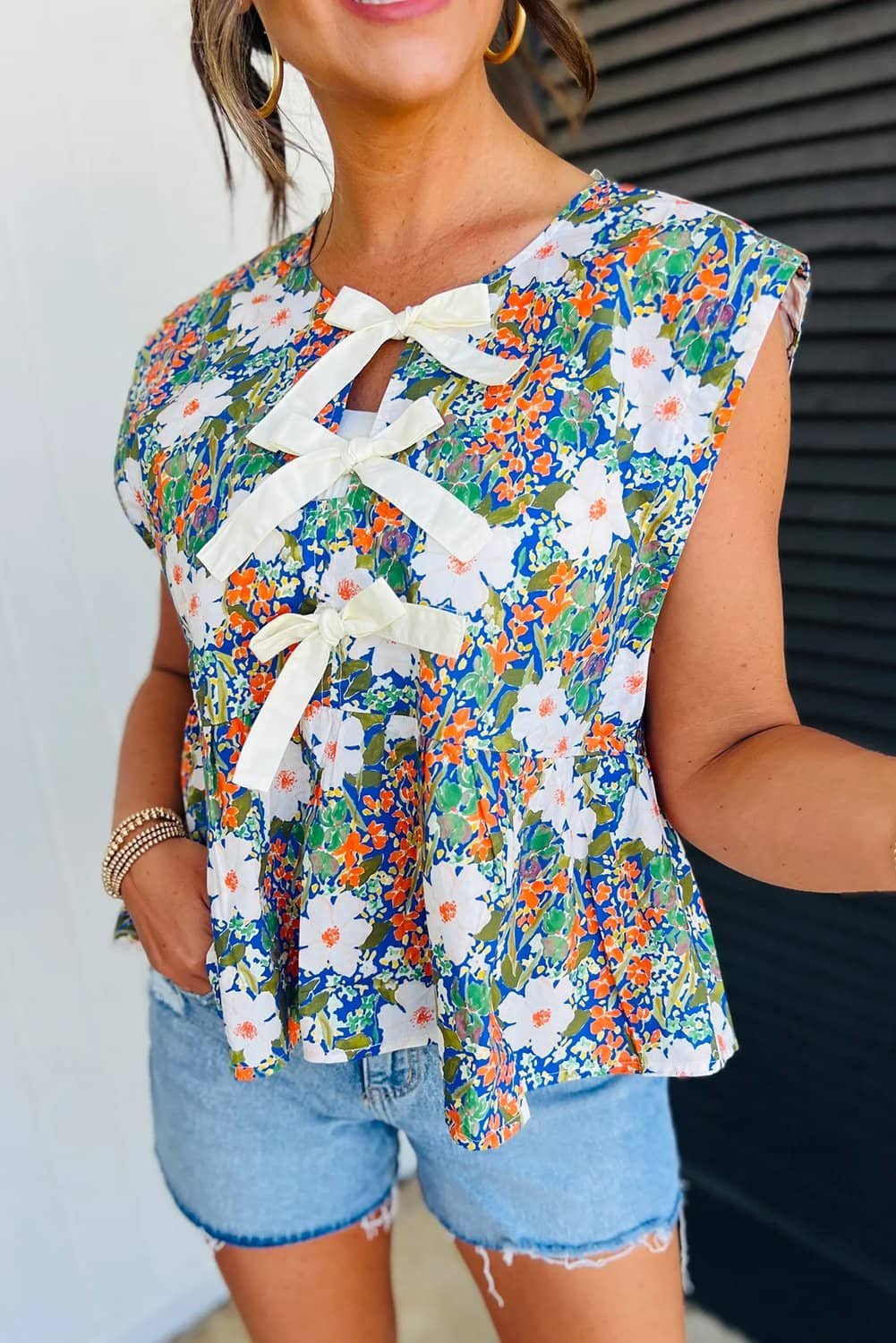Green Floral Print Bow Applique Slit Sleeveless Peplum Blouse