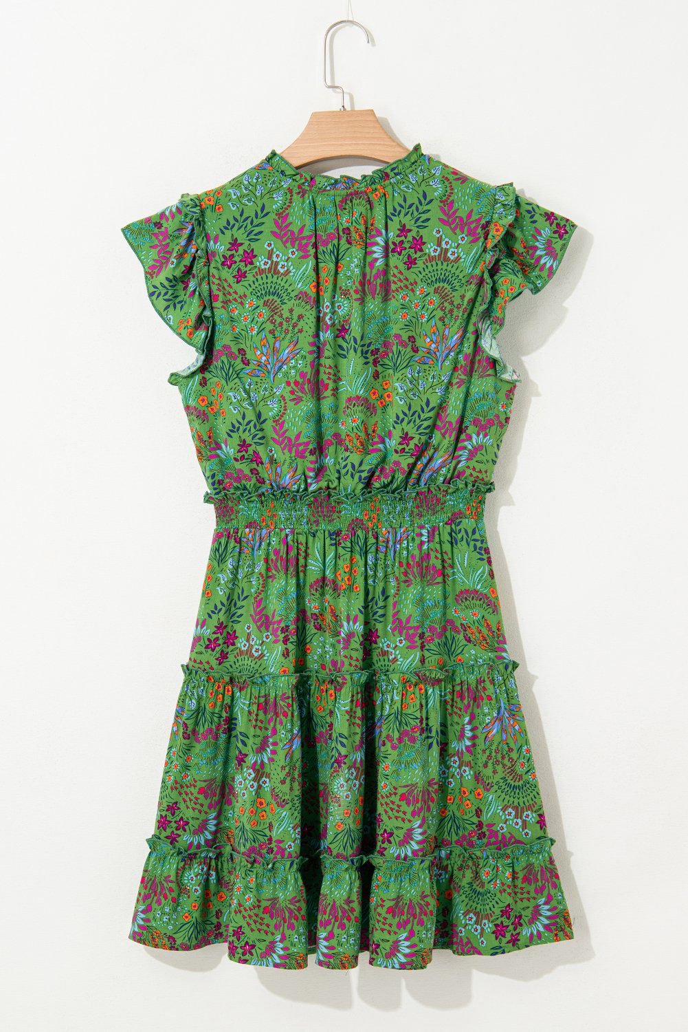 It features a split v neck, flutter sleeves, tunic waist and ruffled hem.