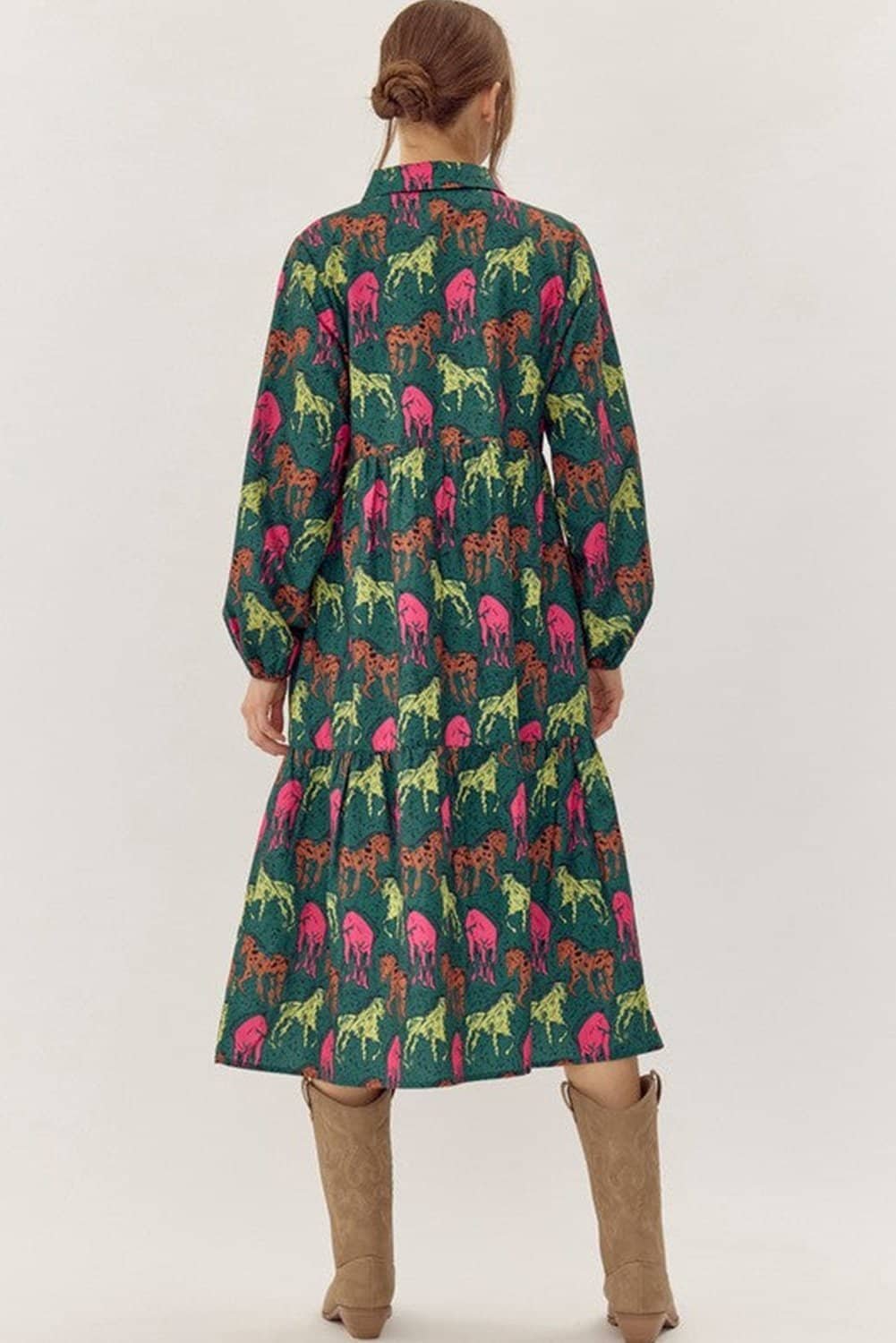 Green Horse Printed Long Sleeve Collared Buttoned Plus Size Midi Dress
