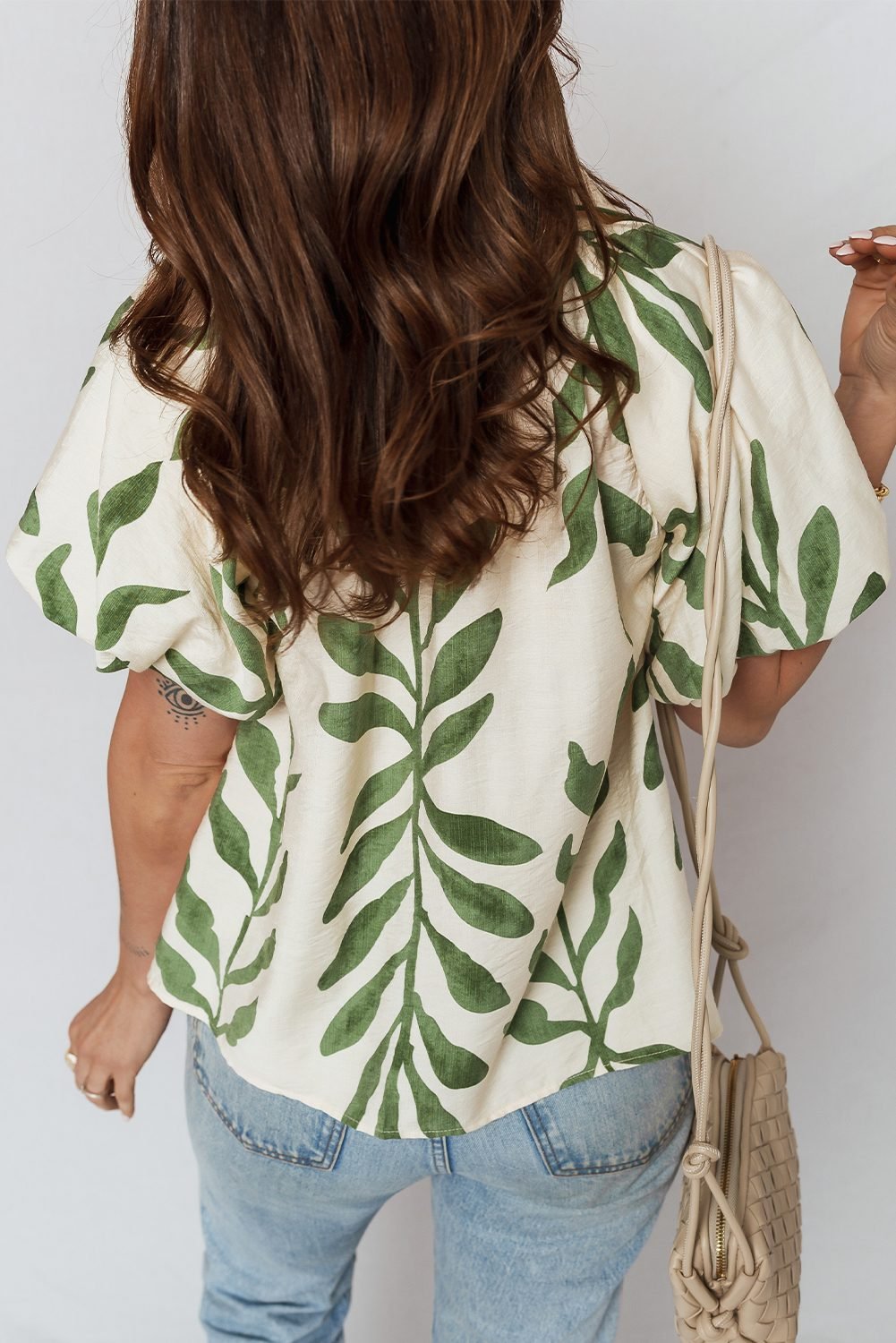 Casual leaf print blouse pairs easily with jeans or skirts.