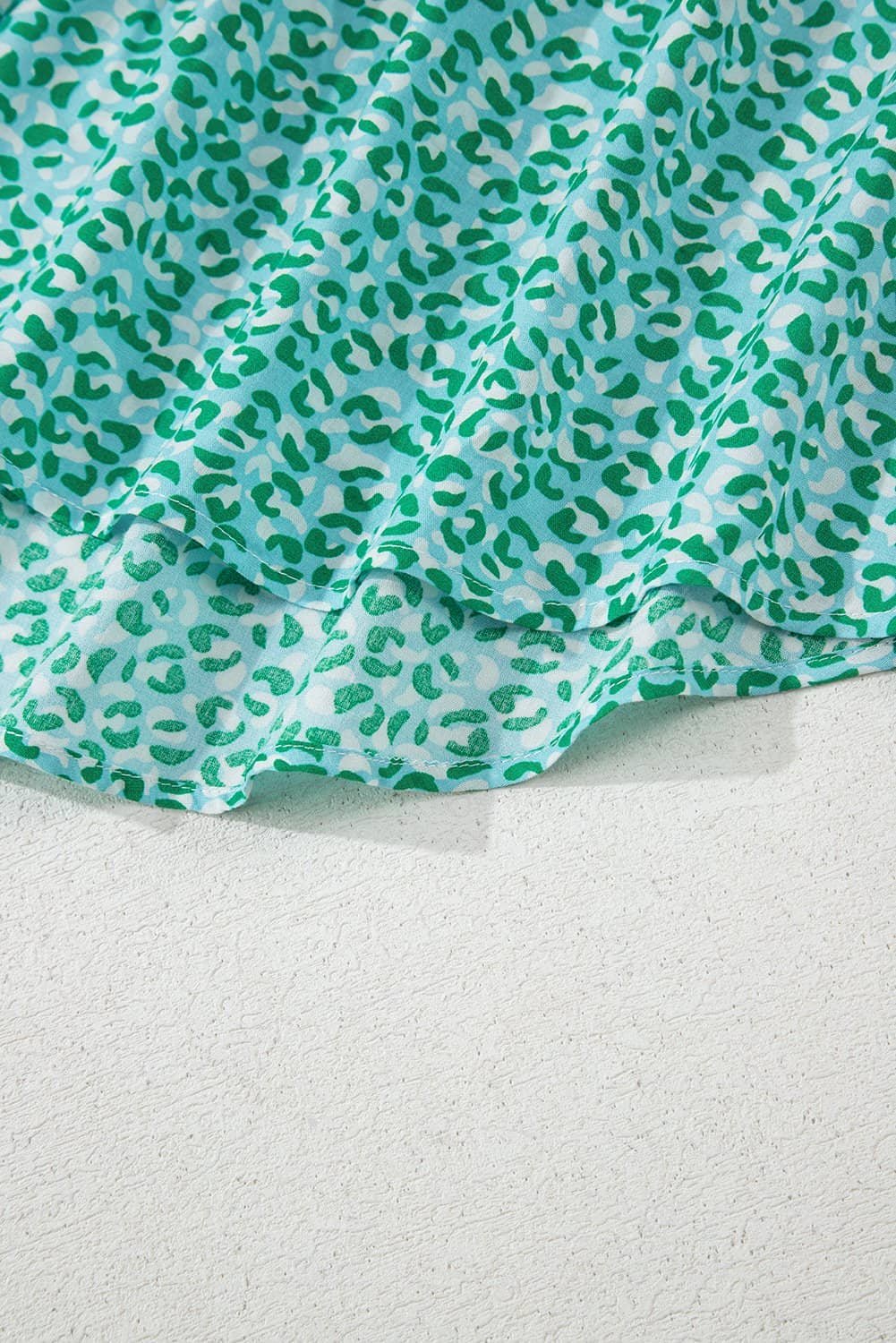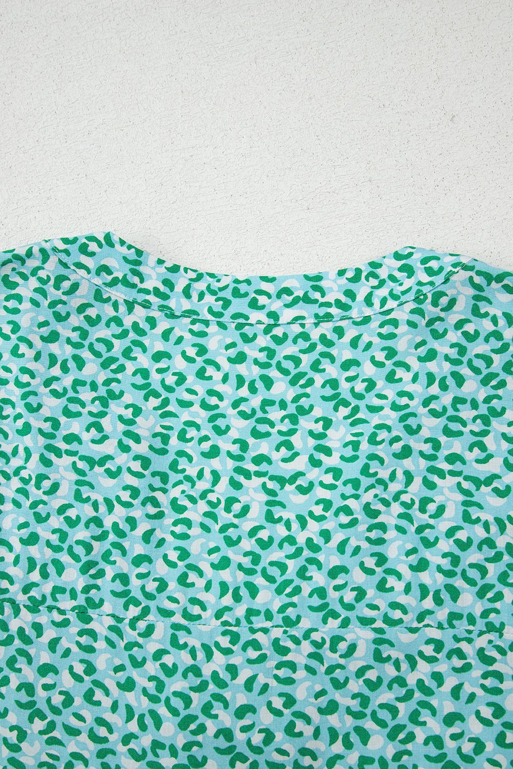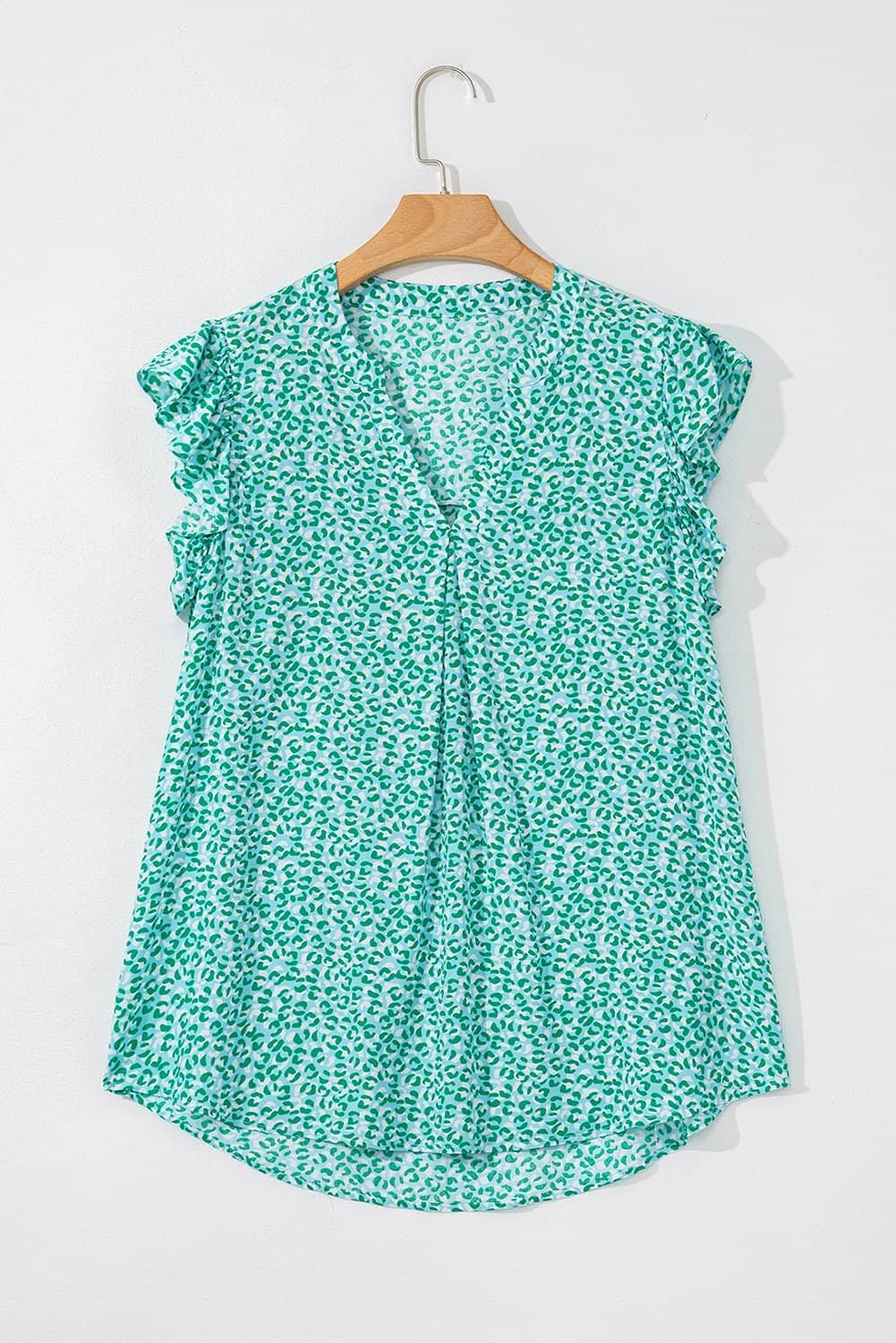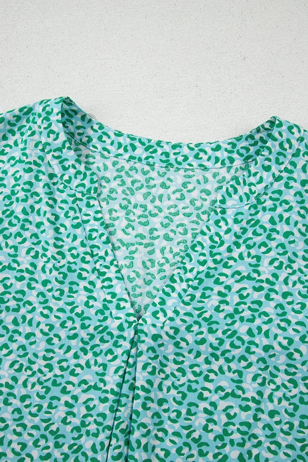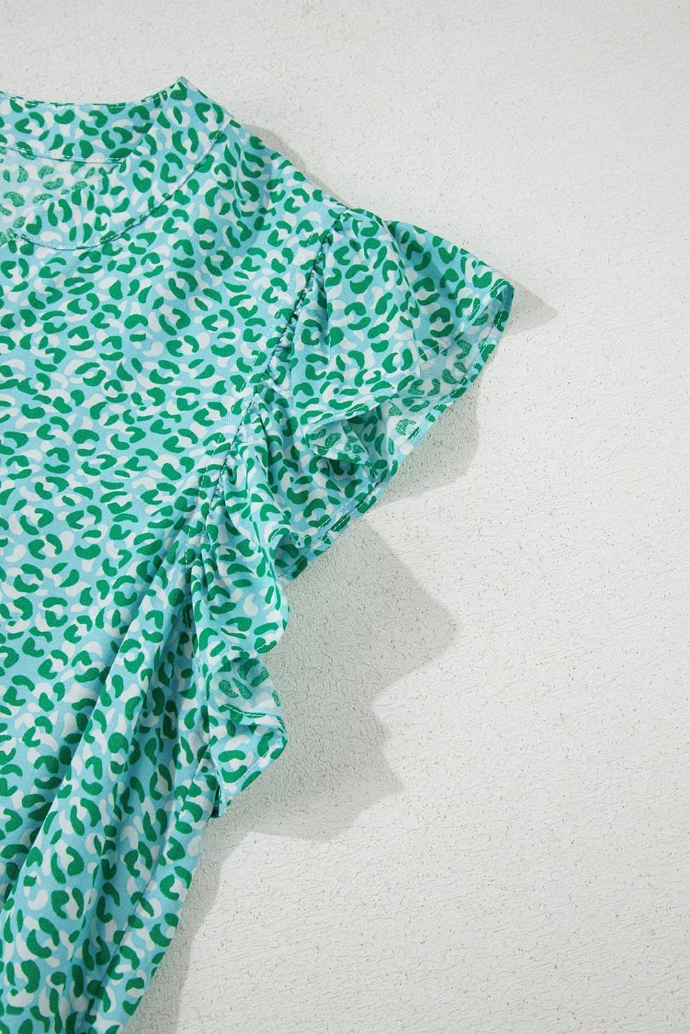 Green Notched V Neck Leopard Ruffle Short Sleeve Blouse