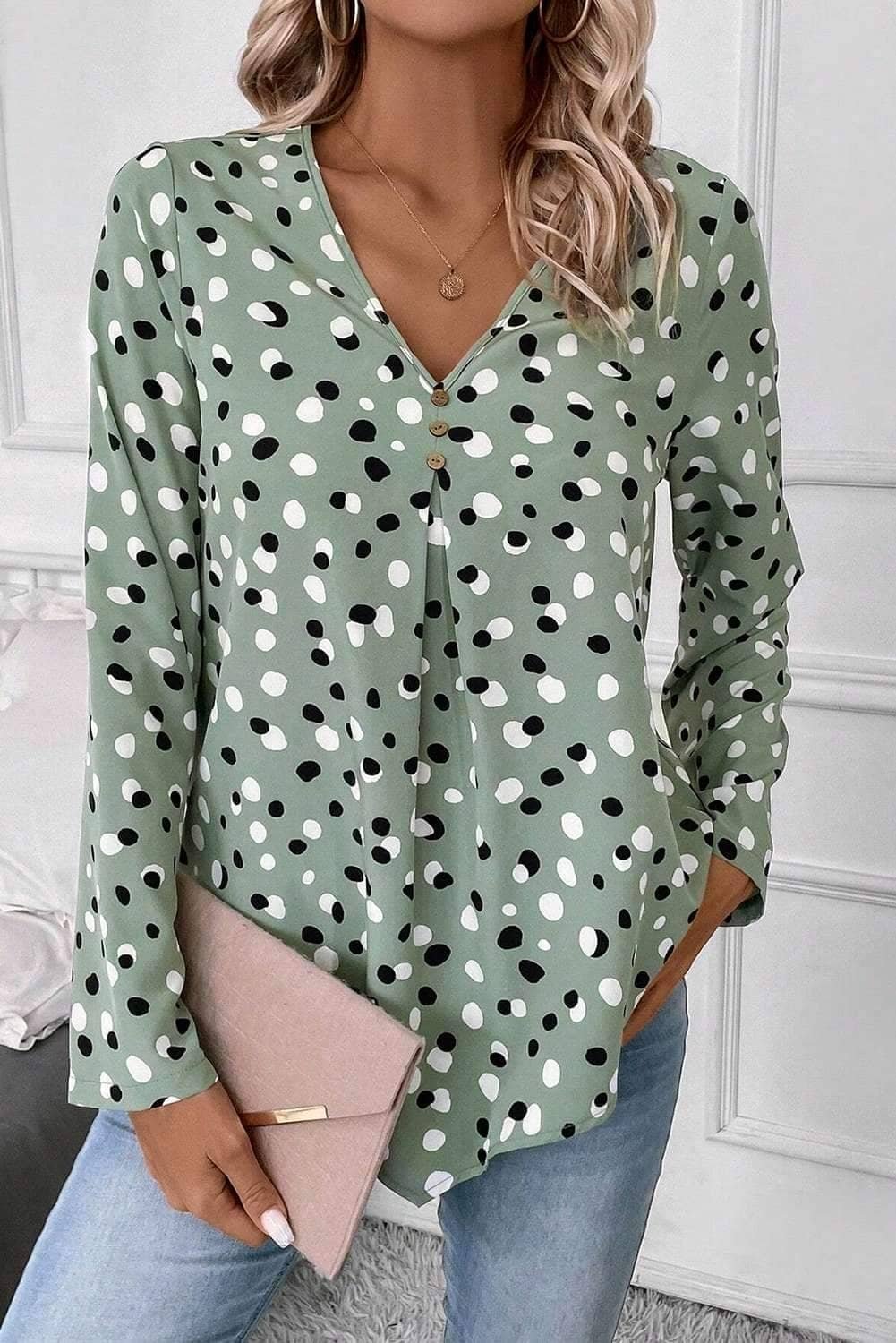 - Polka dot print brings a playful to this sweet blouse.