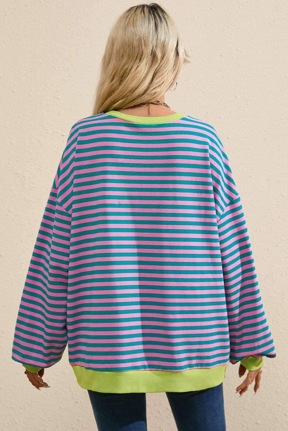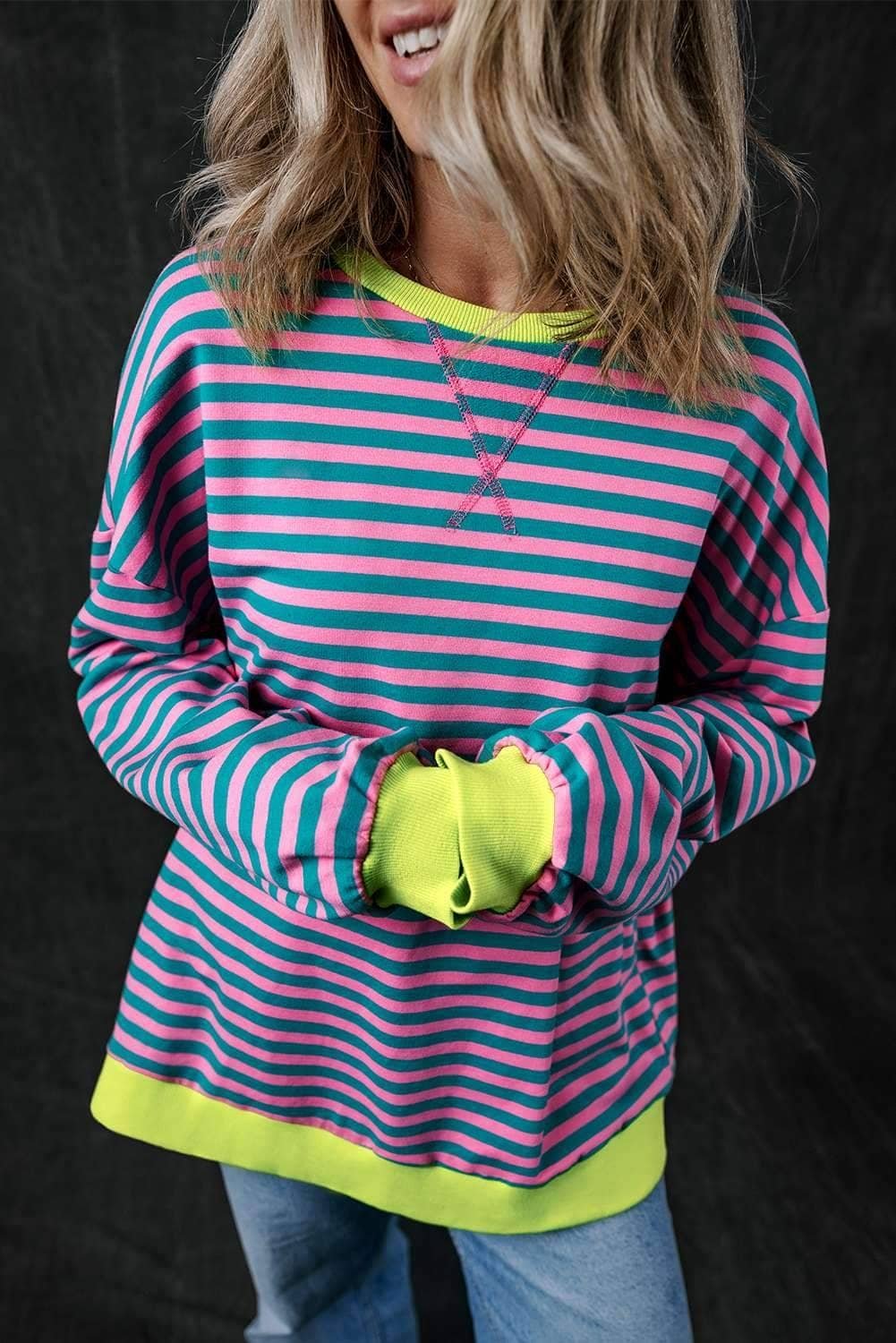 Green Stripe Oversized Contrast Trim Pullover Sweatshirt