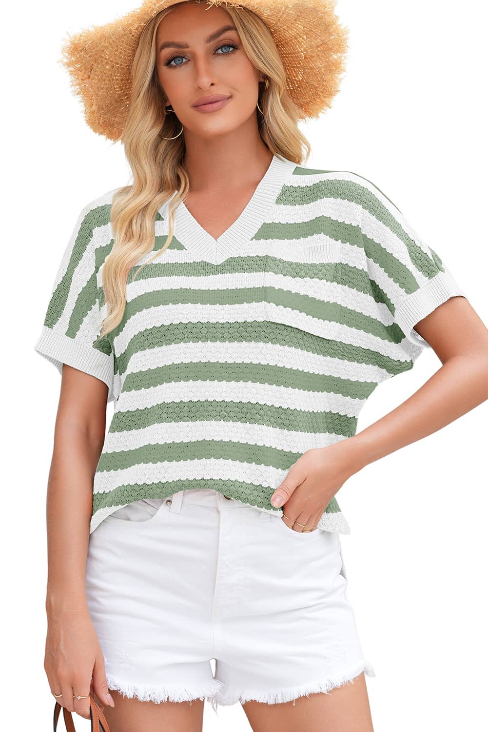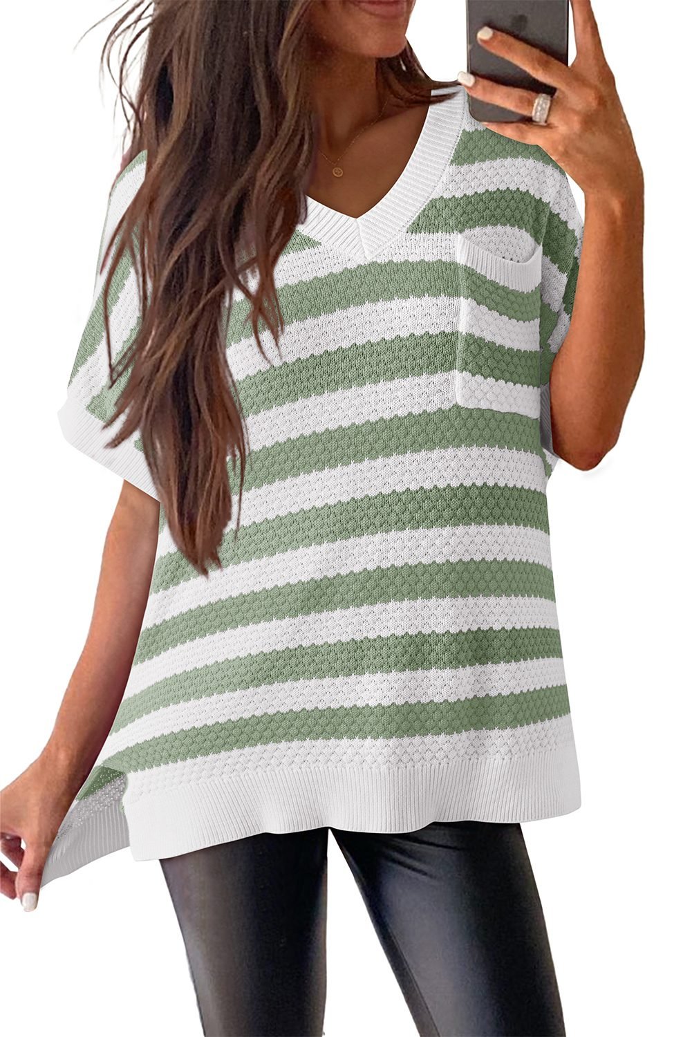 Green Stripe V Neck Short Sleeve Sweater With Side Slits