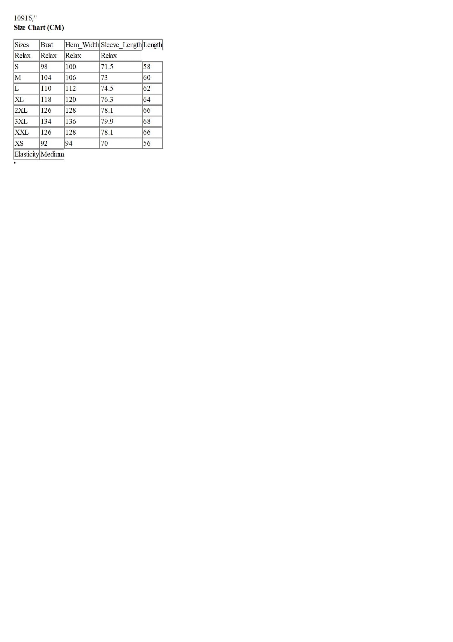 Size Chart (CM)