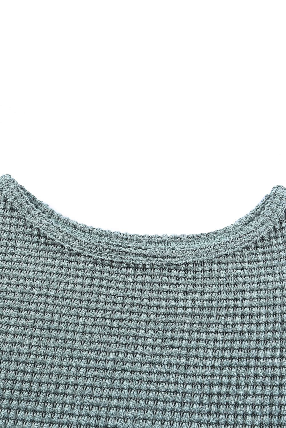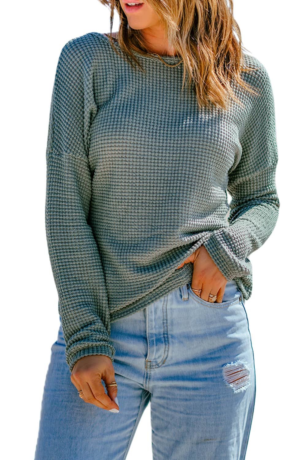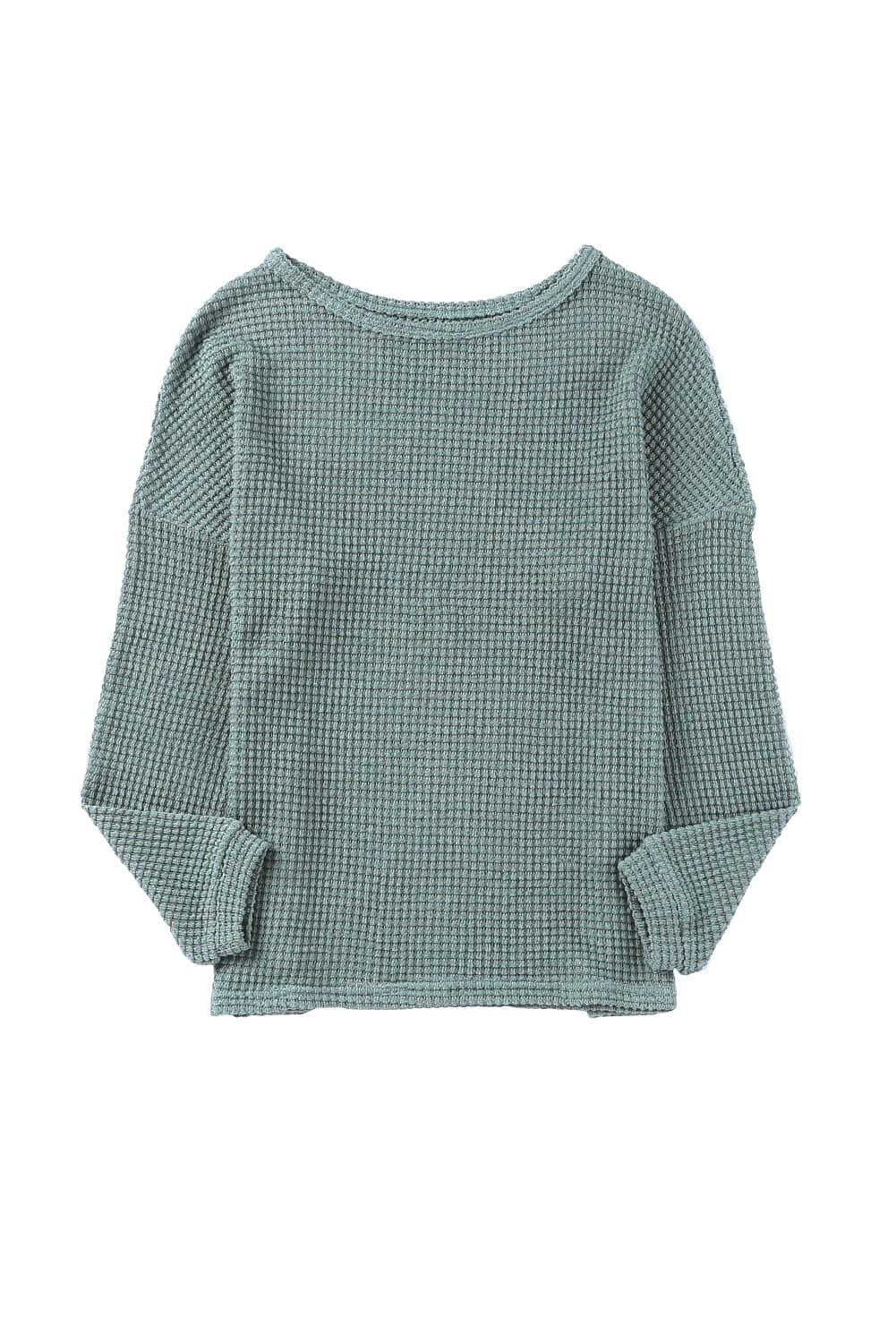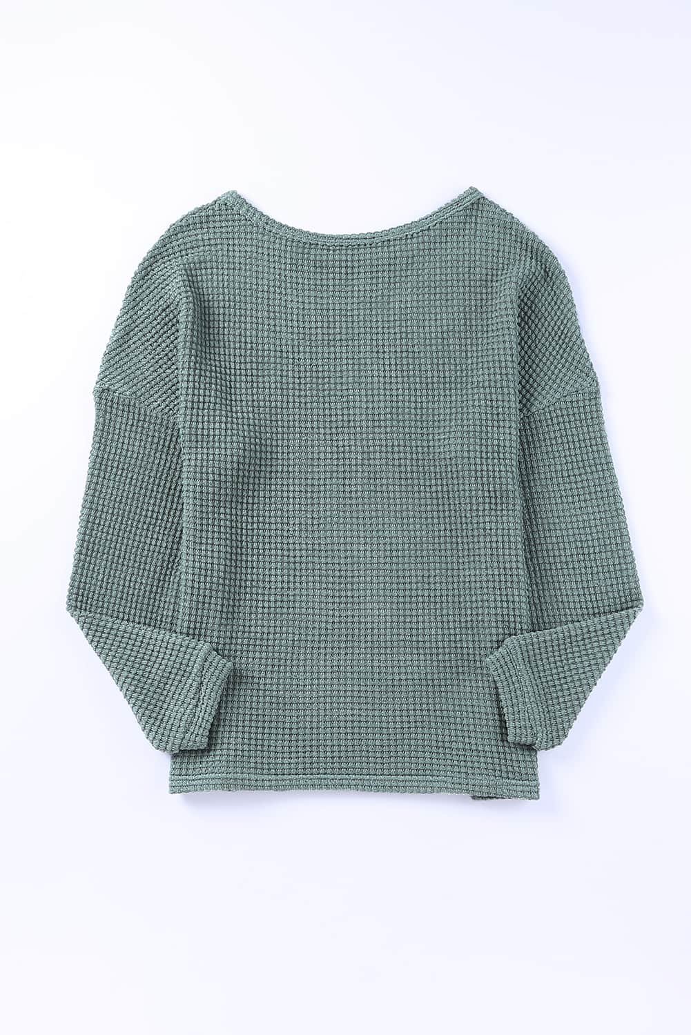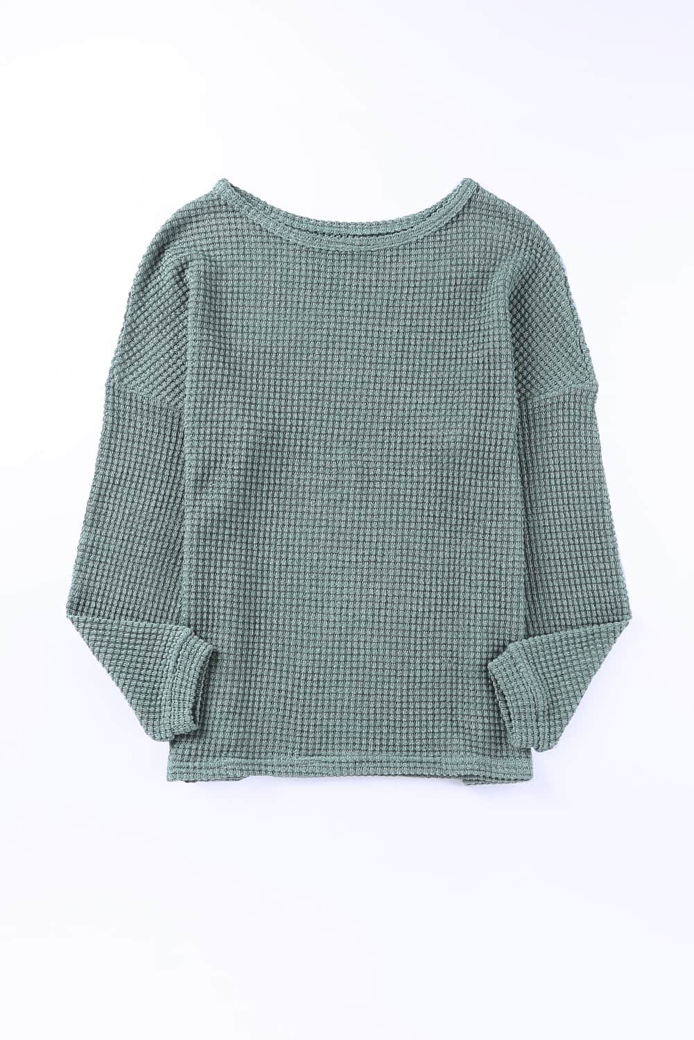 Green Waffle Knit Drop Shoulder Long Sleeve Top