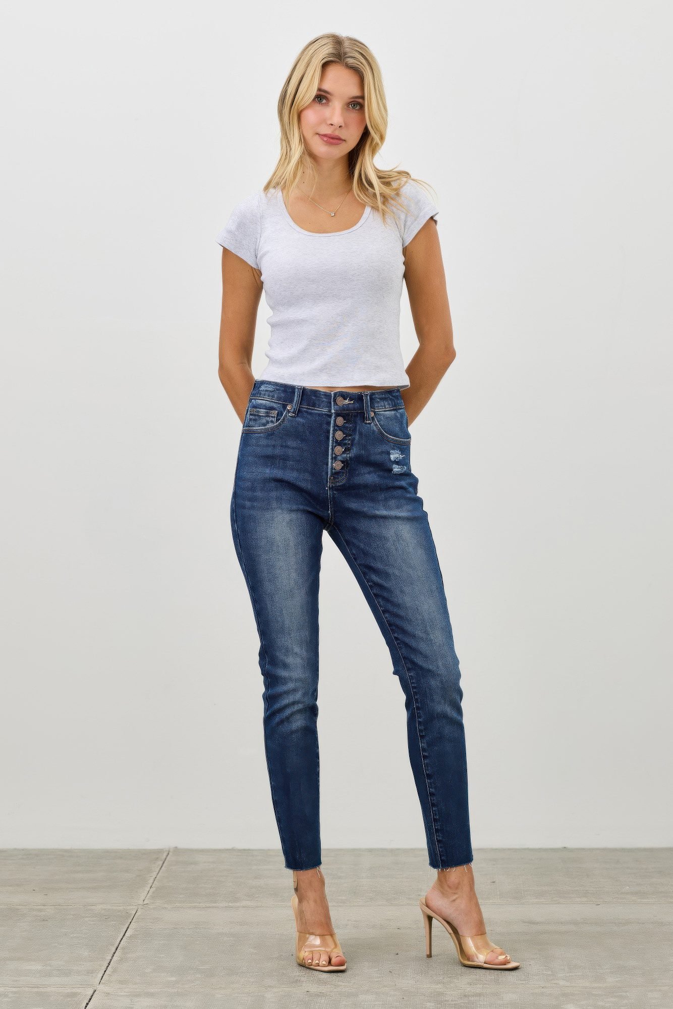 Product Description: Sleek and form-fitting, these high rise ankle skinny jeans are designed to hug your curves with all-day comfort and a modern finish. Made from a soft, stretch-blend fabric, they offer flexibility without losing their shape. The high-rise waist flatters and supports, while the exposed button fly adds a stylish, vintage-inspired touch. Cropped just at the ankle, they pair perfectly with everything from heels to sneakers. A wardrobe staple for clean, elevated denim looks. Product Details: 93% Cotton, 5% Polyester, 2% Spandex High-rise waist with exposed button fly Stretch fabric for a comfortable, body-hugging fit Ankle-length skinny silhouette Classic five-pocket styling Versatile for casual or dressed-up outfits Size Guide: For accurate sizing guidance, please review our size chart available on the website. Shipping and Returns: Fast Shipping: We offer speedy delivery to your doorstep. Hassle-Free Returns: If you’re not completely satisfied, our flexible return policy ensures your peace of mind.