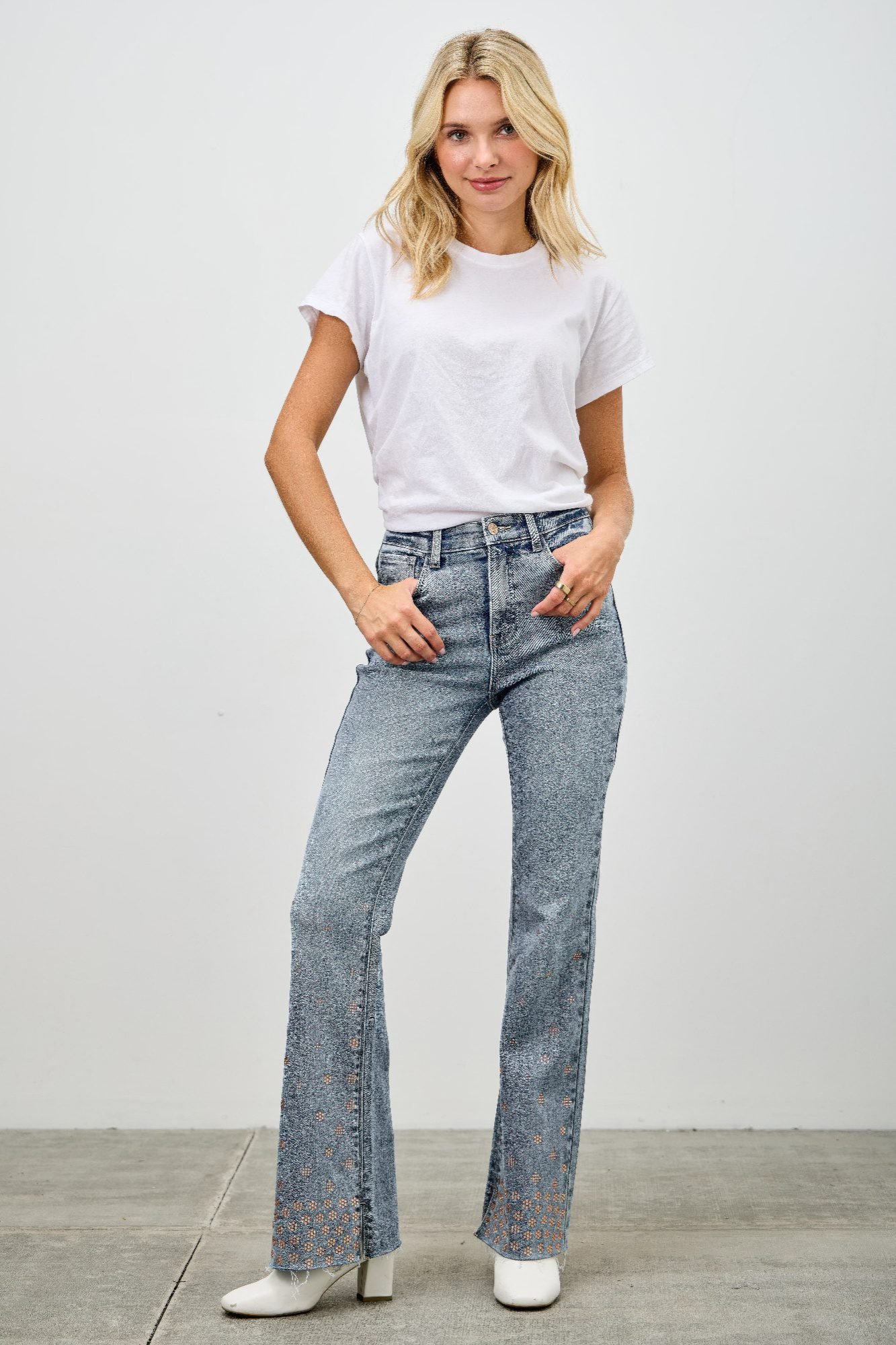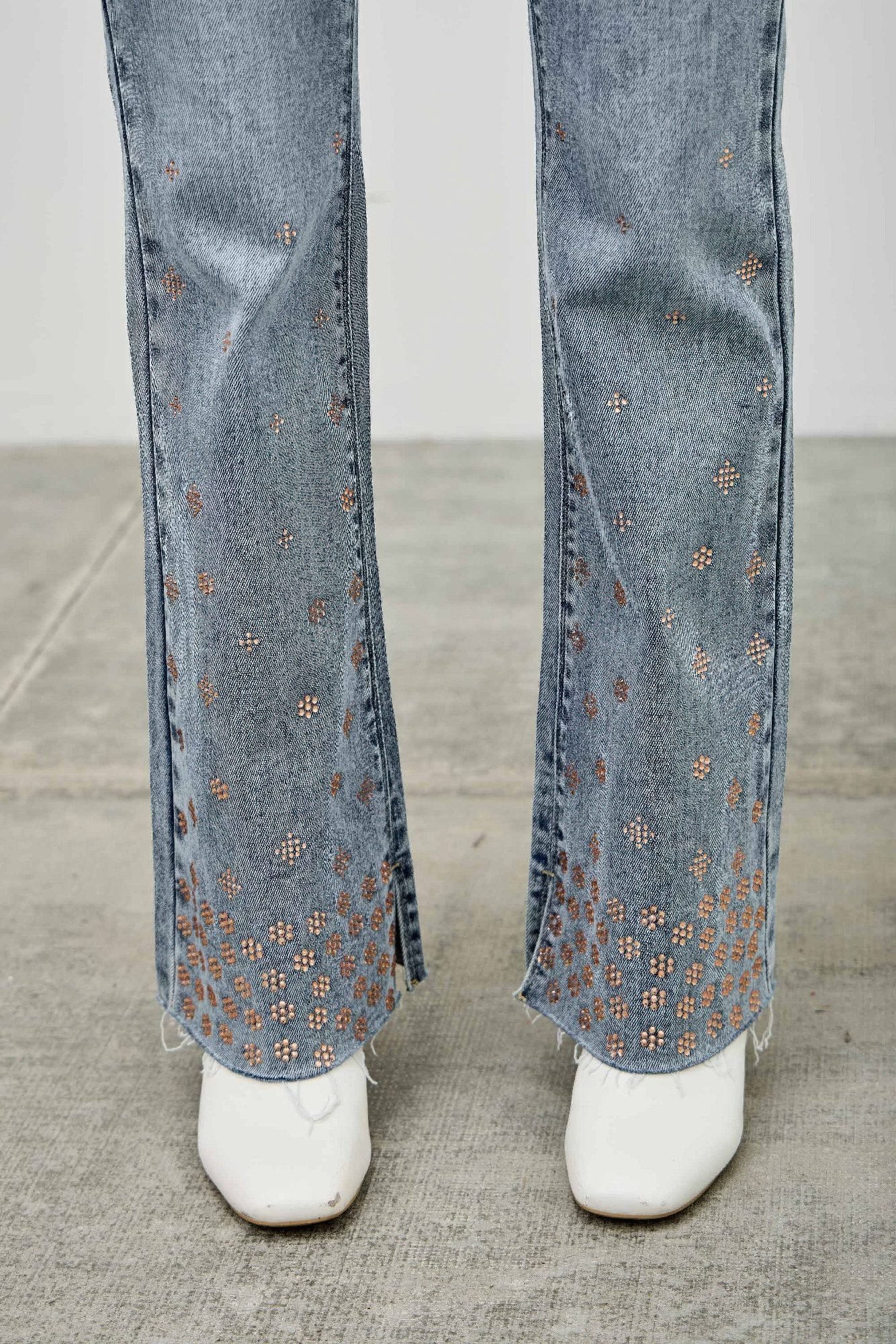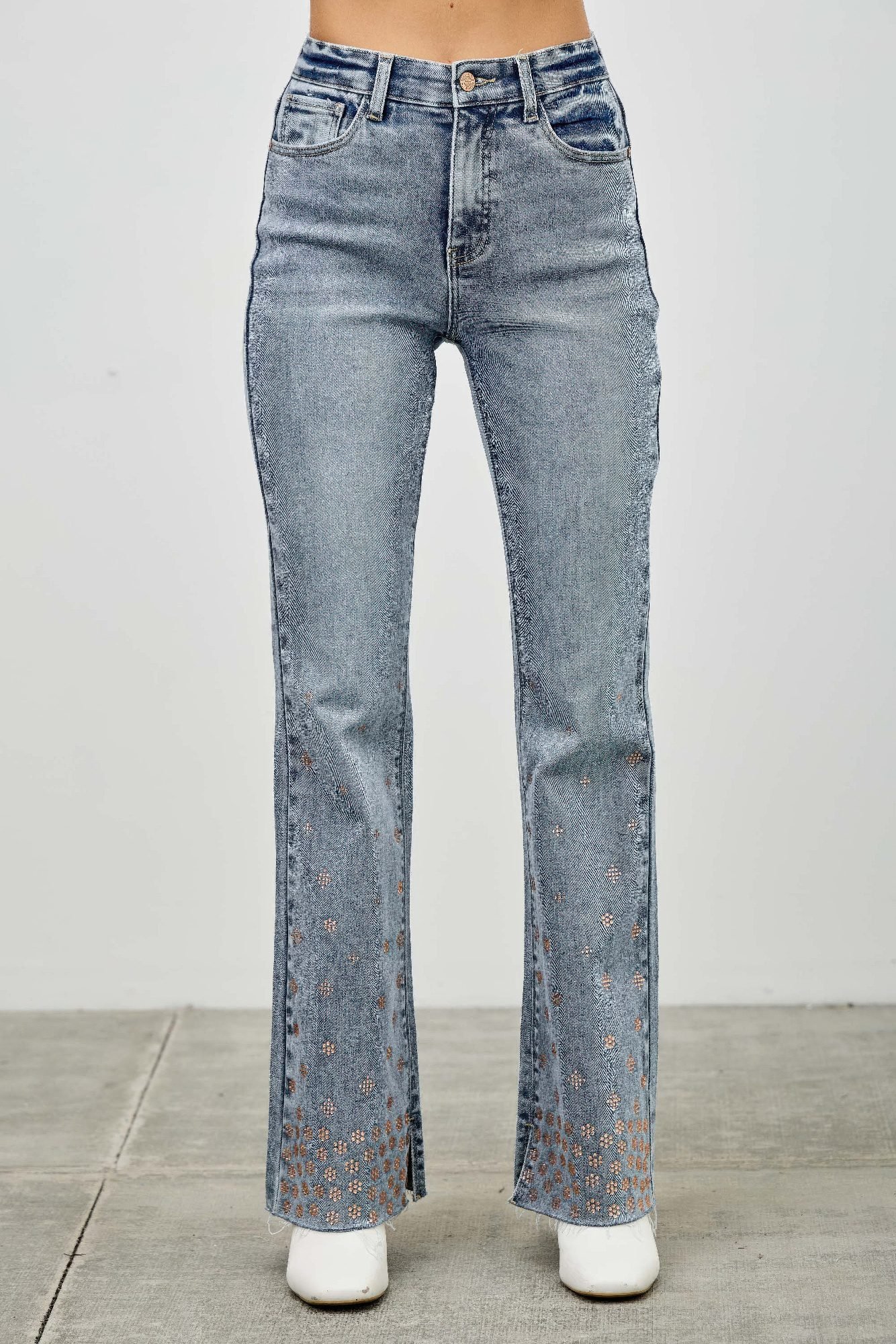 Product Description: Add a touch of sparkle to your denim collection with these high rise kick flare jeans featuring subtle rhinestone embellishments. Designed with a flattering high-rise waist and a slight flare at the hem, they offer a modern take on a retro-inspired silhouette. The stretch-infused fabric provides a comfortable, flexible fit that moves with you. Finished with classic five-pocket styling and a clean zipper fly, these jeans are perfect for dressing up your everyday looks with a hint of glam. Product Details: 93% Cotton, 5% Polyester, 2% Spandex High-rise waist with zipper fly closure Kick flare leg for a flattering shape Rhinestone embellishments for subtle sparkle Stretch denim for added comfort and movement Classic five-pocket design Size Guide: For accurate sizing guidance, please review our size chart available on the website. Shipping and Returns: Fast Shipping: We offer speedy delivery to your doorstep. Hassle-Free Returns: If you’re not completely satisfied, our flexible return policy ensures your peace of mind.