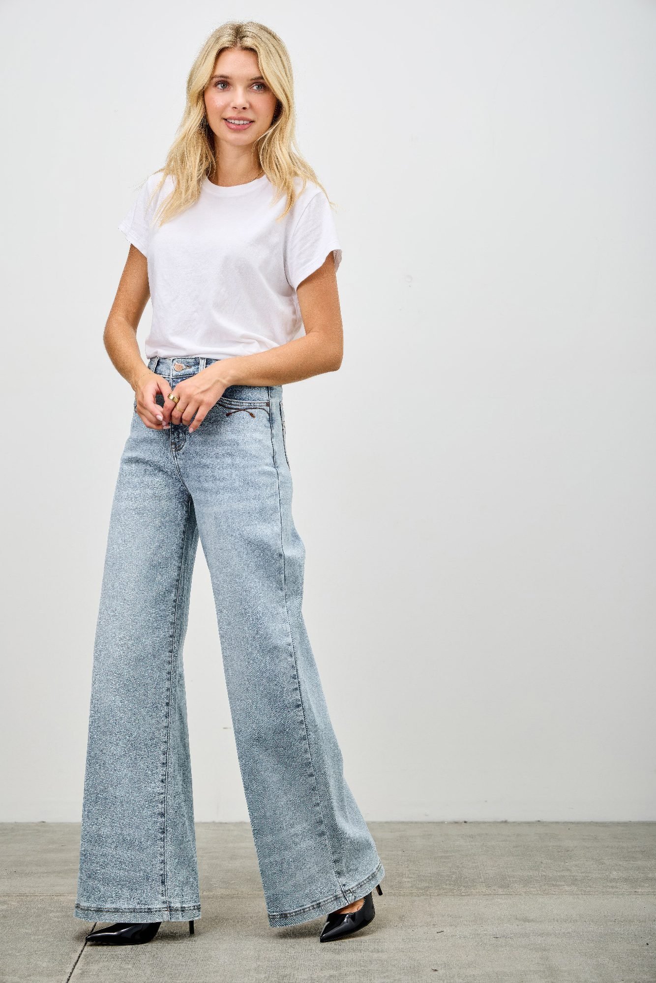 Product Description: Elevate your everyday denim with these high rise wide leg jeans, designed to offer a flattering silhouette with all-day comfort. Crafted from a soft, stretch-infused fabric, they contour through the waist and hips before flowing into a wide leg for a polished yet relaxed fit. The high-rise waist enhances your shape, while classic five-pocket styling and a zipper fly complete the timeless look. Perfect for pairing with everything from structured blouses to casual tees, these jeans are a modern wardrobe staple. Product Details: 93% Cotton, 5% Polyester, 2% Spandex High-rise waist with zip fly closure Wide leg silhouette for a flattering drape Stretch fabric for comfort and ease of movement Classic five-pocket styling Ideal for both casual and elevated looks Size Guide: For accurate sizing guidance, please review our size chart available on the website. Shipping and Returns: Fast Shipping: We offer speedy delivery to your doorstep. Hassle-Free Returns: If you’re not completely satisfied, our flexible return policy ensures your peace of mind.