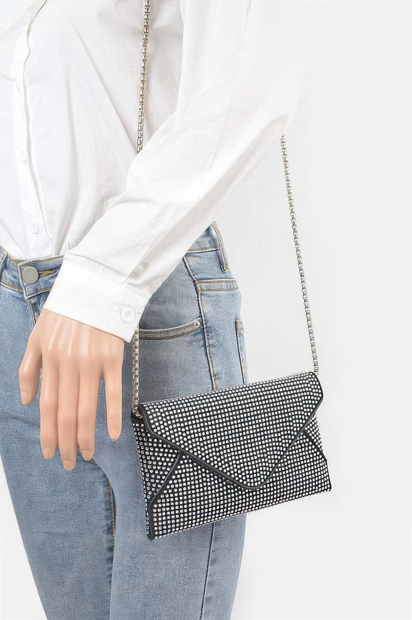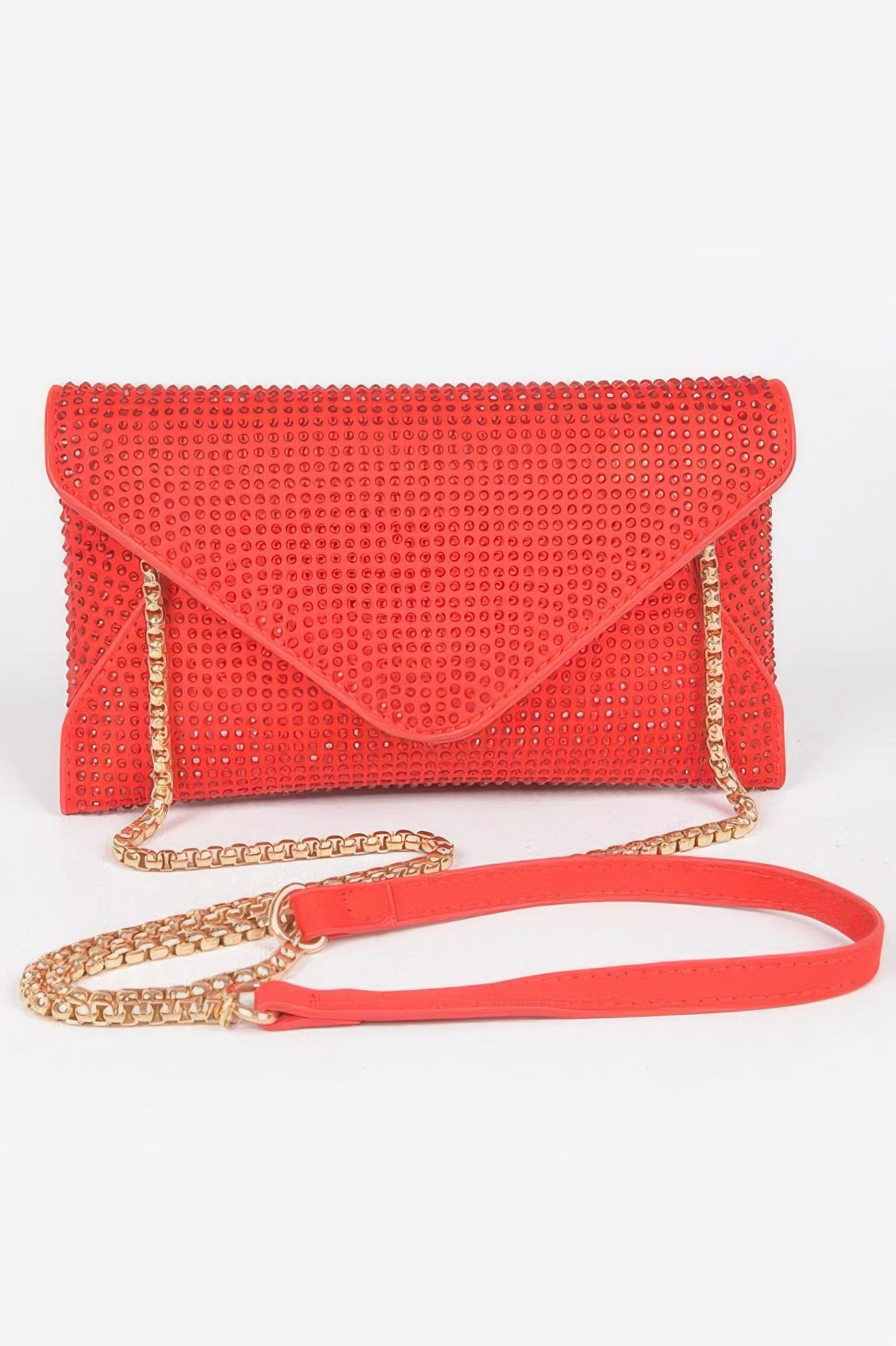 Product Description:Add instant sparkle to your evening look with the Hot Fix Rhinestones Envelope Clutch. Featuring a sleek silhouette and shimmering rhinestone detailing, this clutch is designed to dazzle. The envelope-style flap gives it a refined edge, while the compact size makes it perfect for carrying your night-out essentials. Crafted from durable polyurethane with mixed metal accents, it’s as functional as it is glamorous. Whether you’re attending a formal event or a night on the town, this clutch delivers standout shine.Product Details:Made from Polyurethane, Rhinestone, and Mixed MetalDimensions: 8.25W x 4.5H x 0.5D inchesHot fix rhinestones for a sparkling, secure embellishmentSleek envelope flap for a polished, modern lookCompact size ideal for carrying essentials like phone, cards, and lipstickPerfect for weddings, parties, or special evening occasionsSize Guide:For accurate sizing guidance, please review our size chart available on the website.Shipping and Returns:Fast Shipping: We offer speedy delivery to your doorstep.Hassle-Free Returns: If you’re not completely satisfied, our flexible return policy ensures your peace of mind.