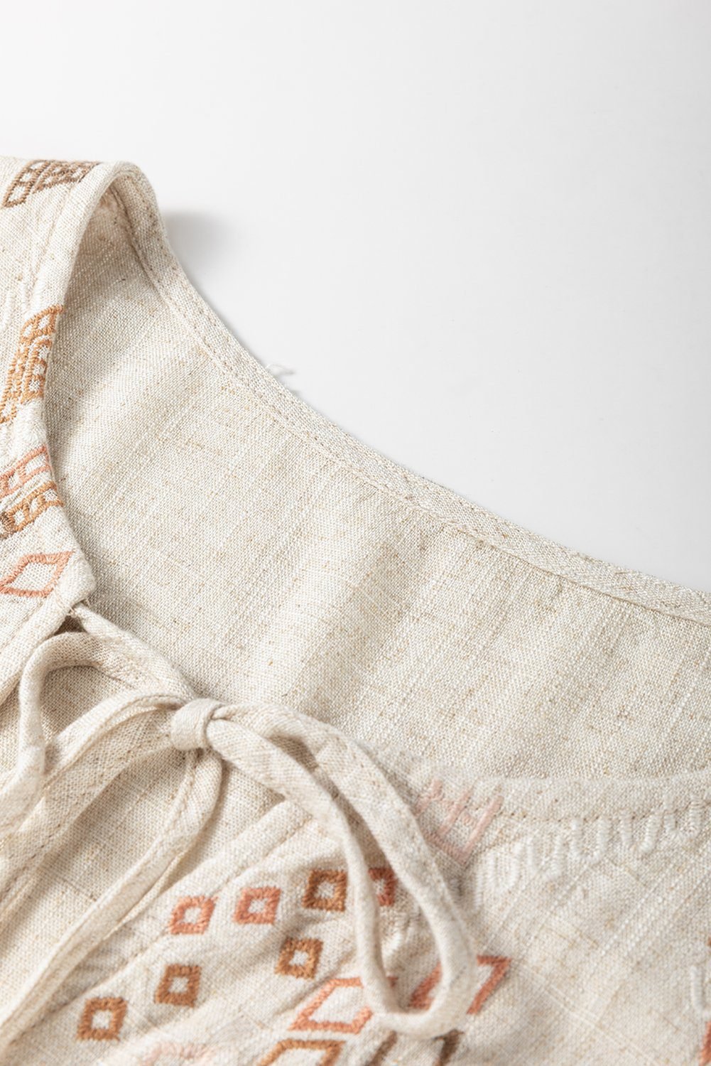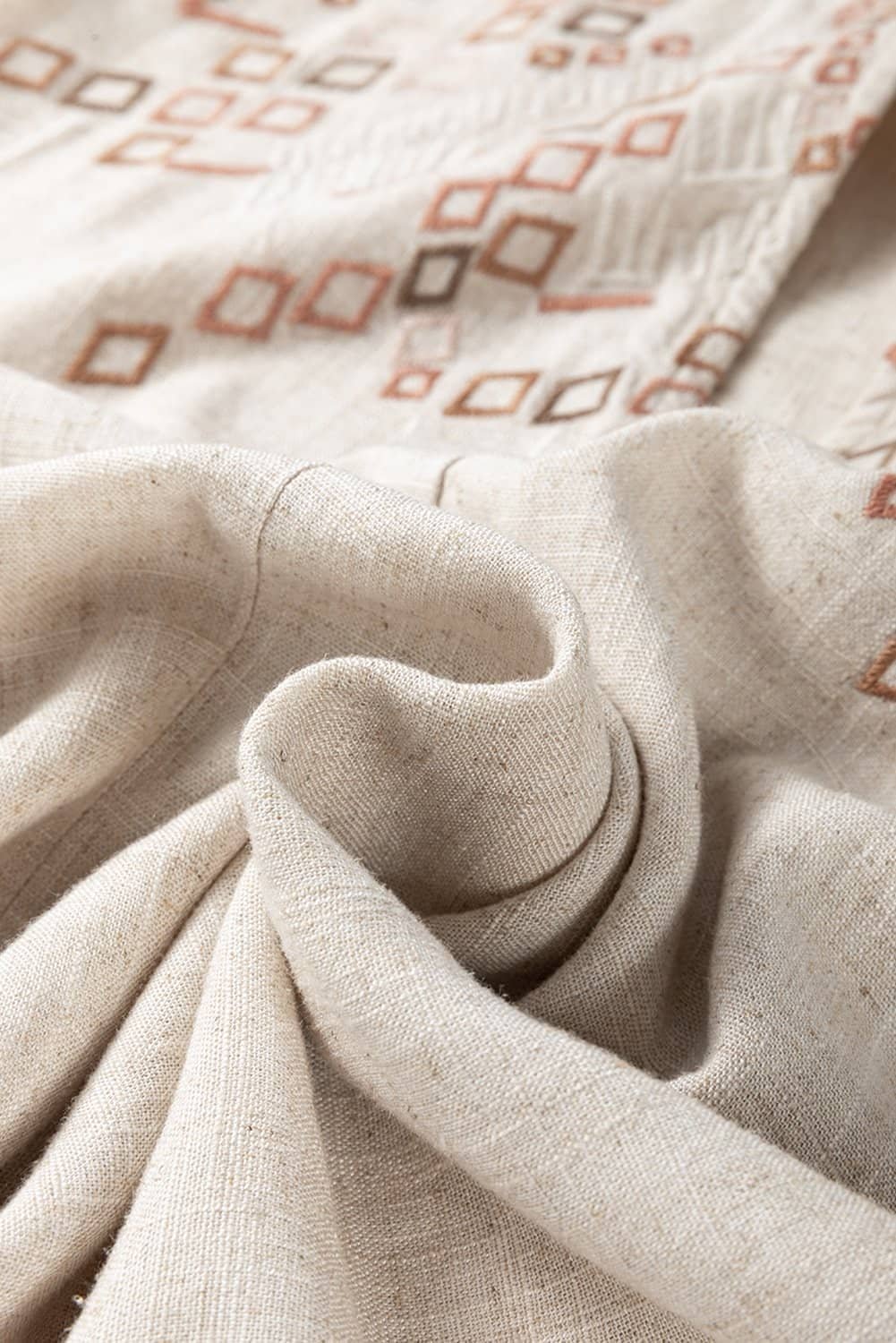 The intricate geometric embroidery showcases a unique and artistic design.