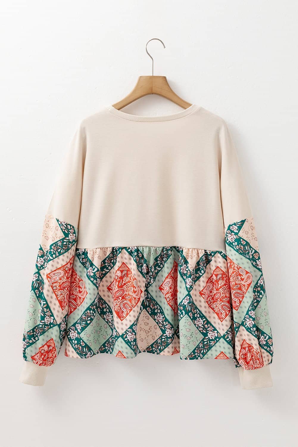 This patchwork top has a crew neck, bubble sleeves and flowy fit.