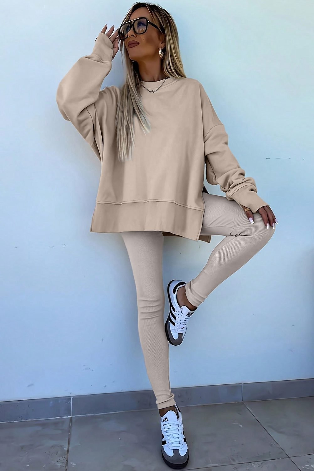 Oversize slit sweatshirt adds a trendy, relaxed silhouette.