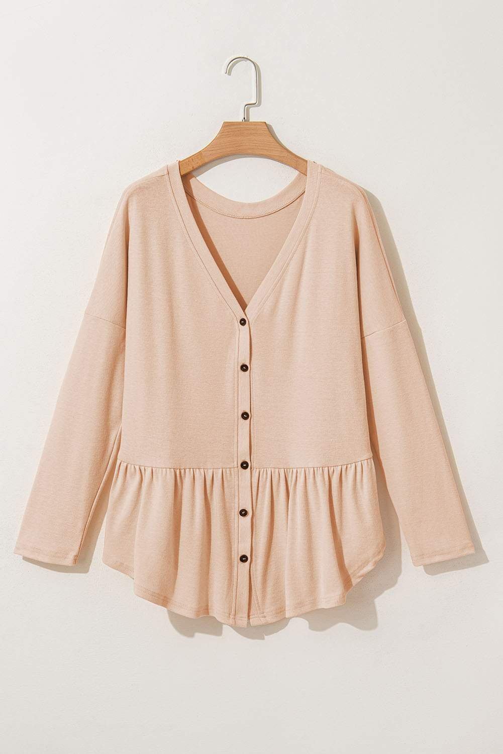 Be the first to review “Jet Stream Solid Ruffled Buttoned V Neck Shirt”