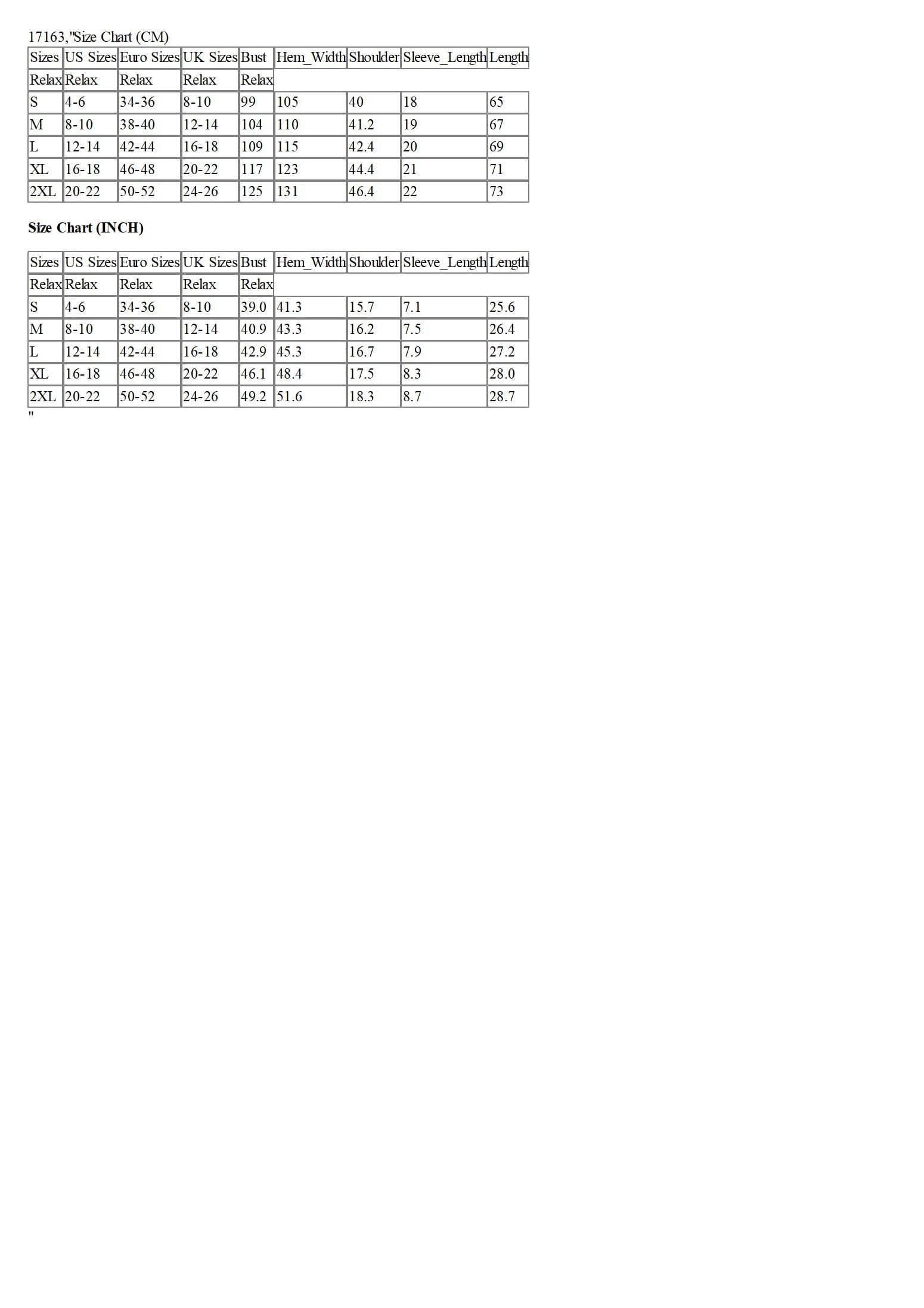 Sizes | US Sizes | Euro Sizes | UK Sizes | Bust | Hem_Width | Shoulder | Sleeve_Length | Length |